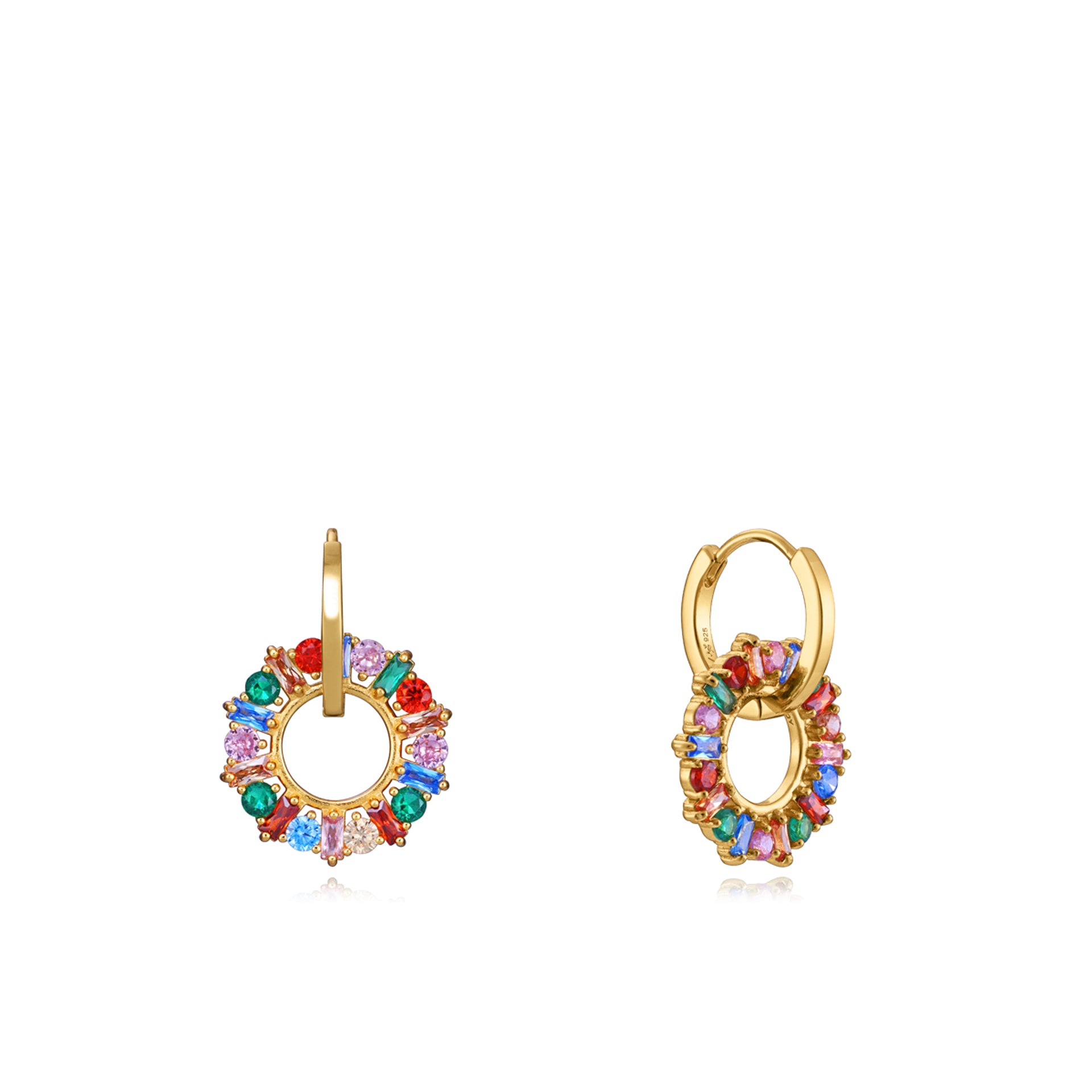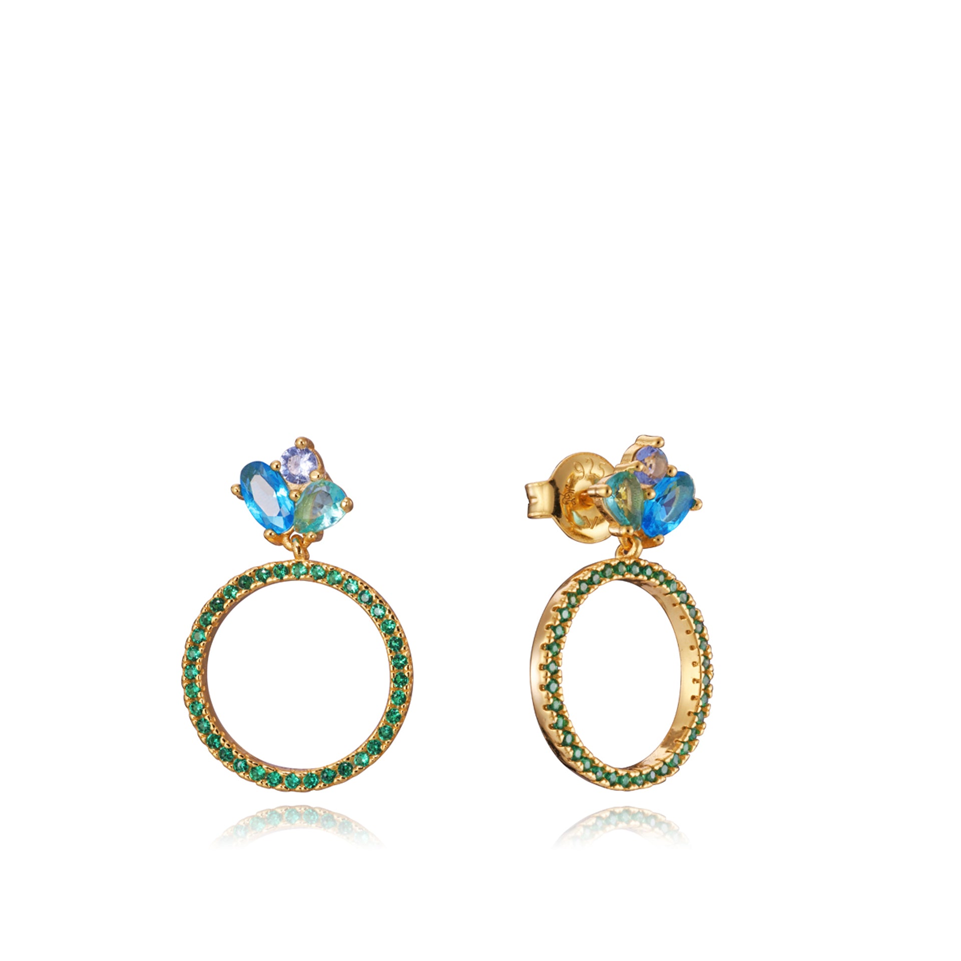 Pendientes de plata de ley bañados en oro con círculos unidos y circonitas de colores