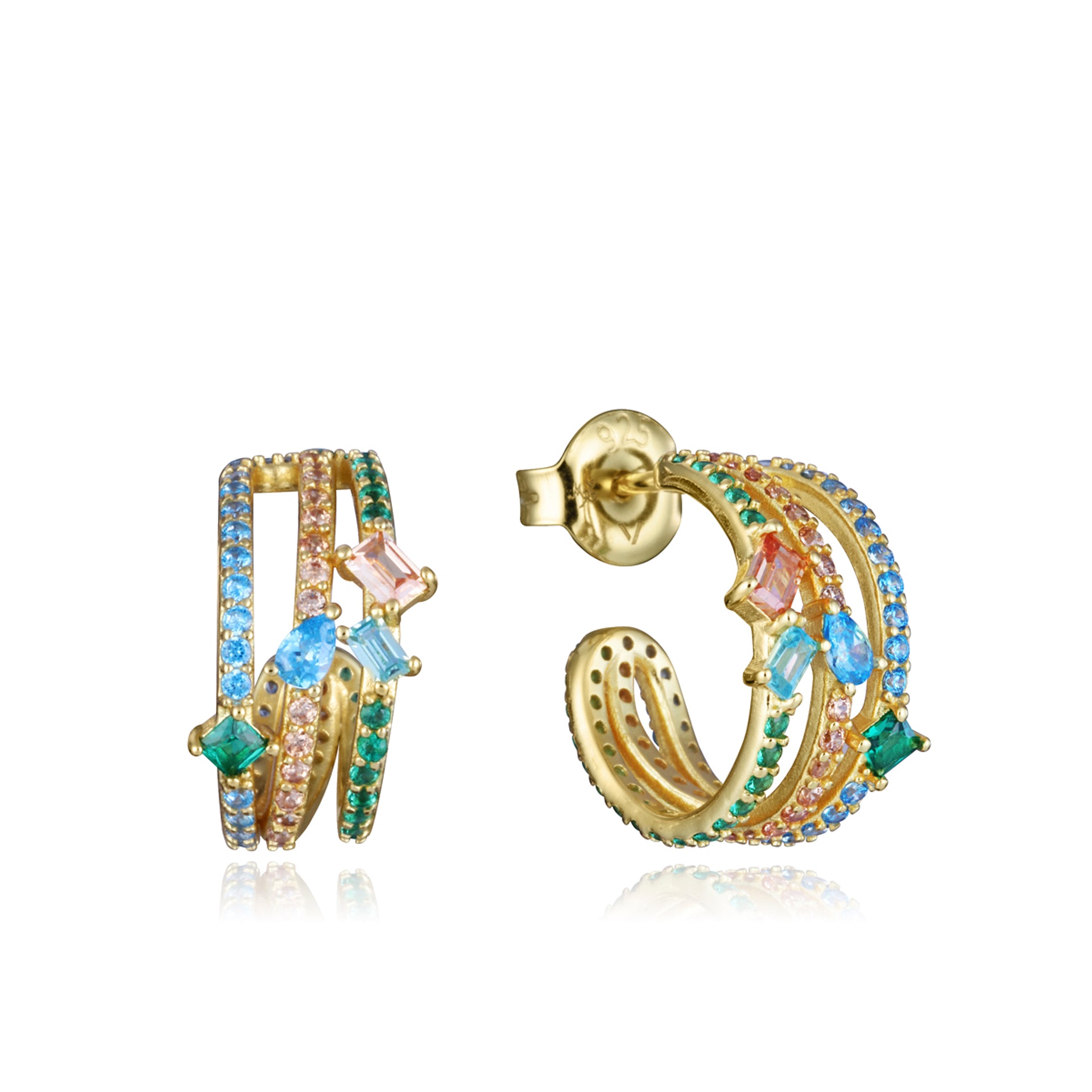 Collar Elegant de plata de ley con baño de oro y mini aros de circonitas de colores