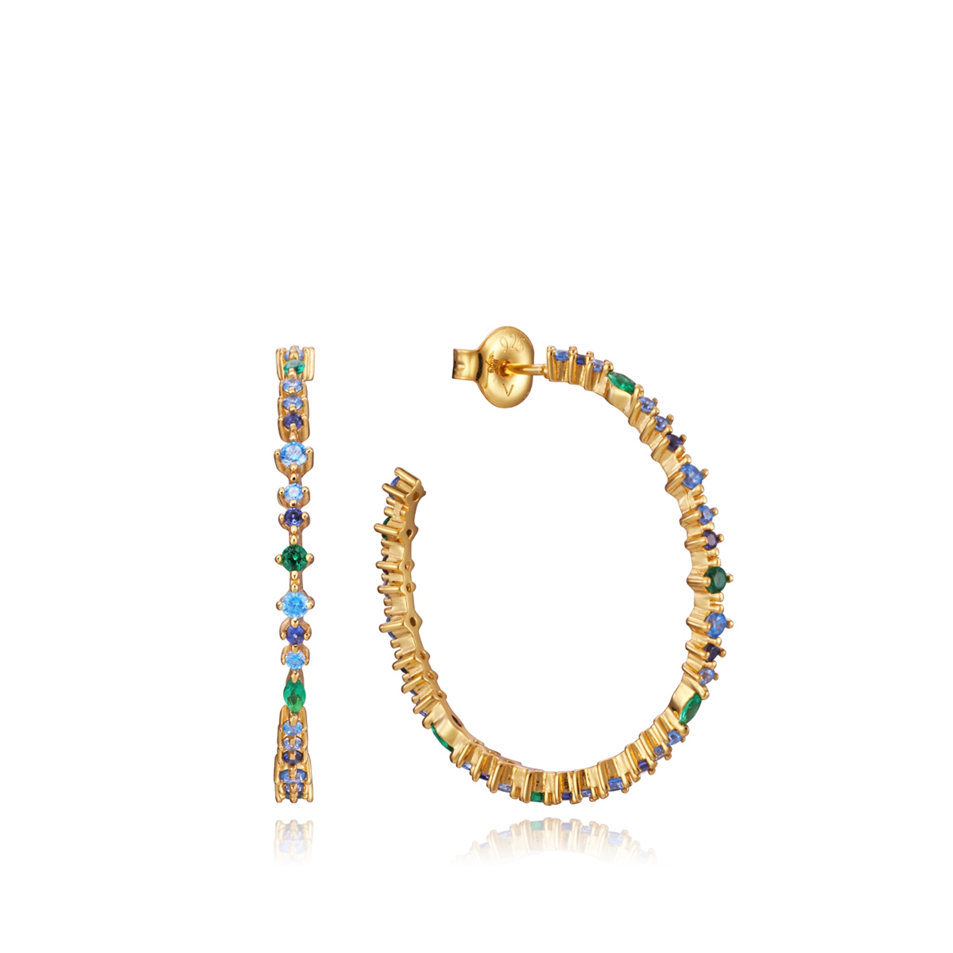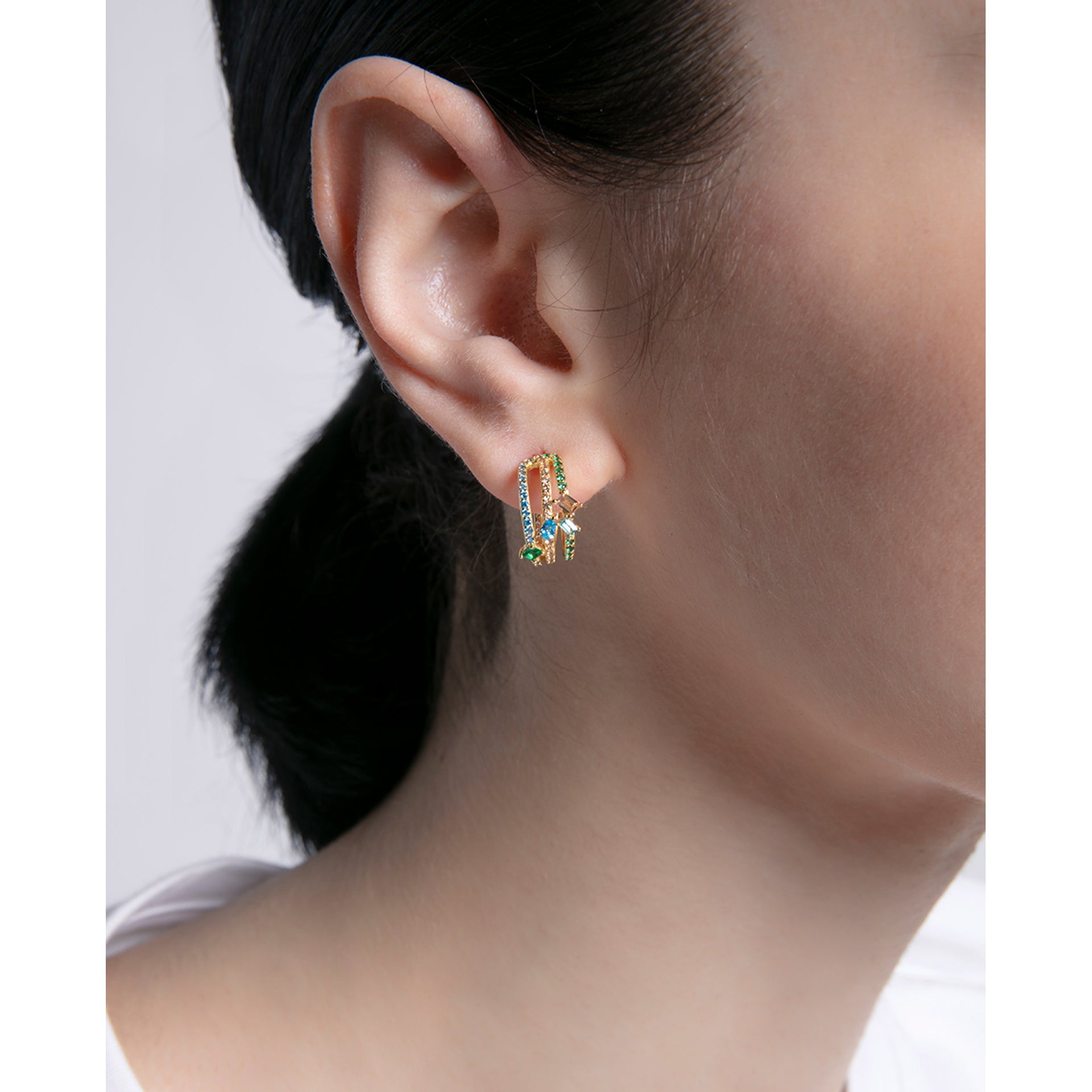 Pendientes Elegant de plata de ley dorada con doble tira de circonitas verdes y azules