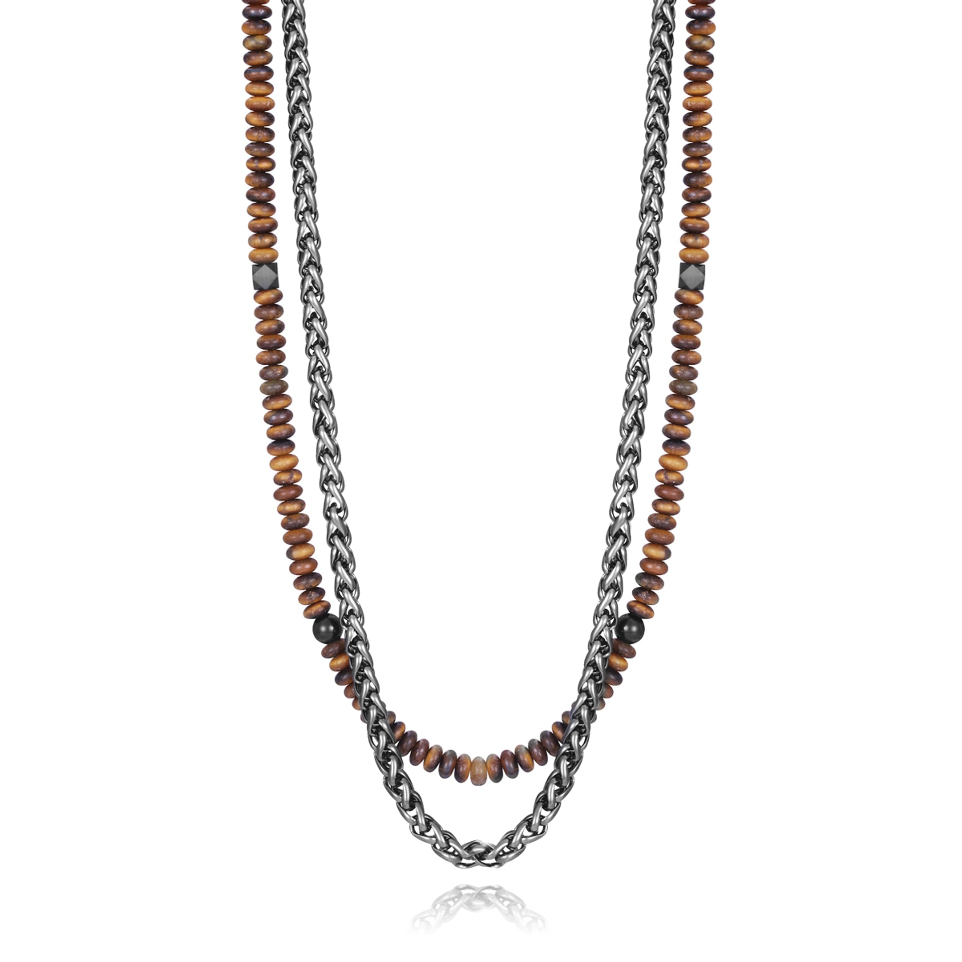 Collar doble de acero y piedras naturales de agata negra con Ip gris