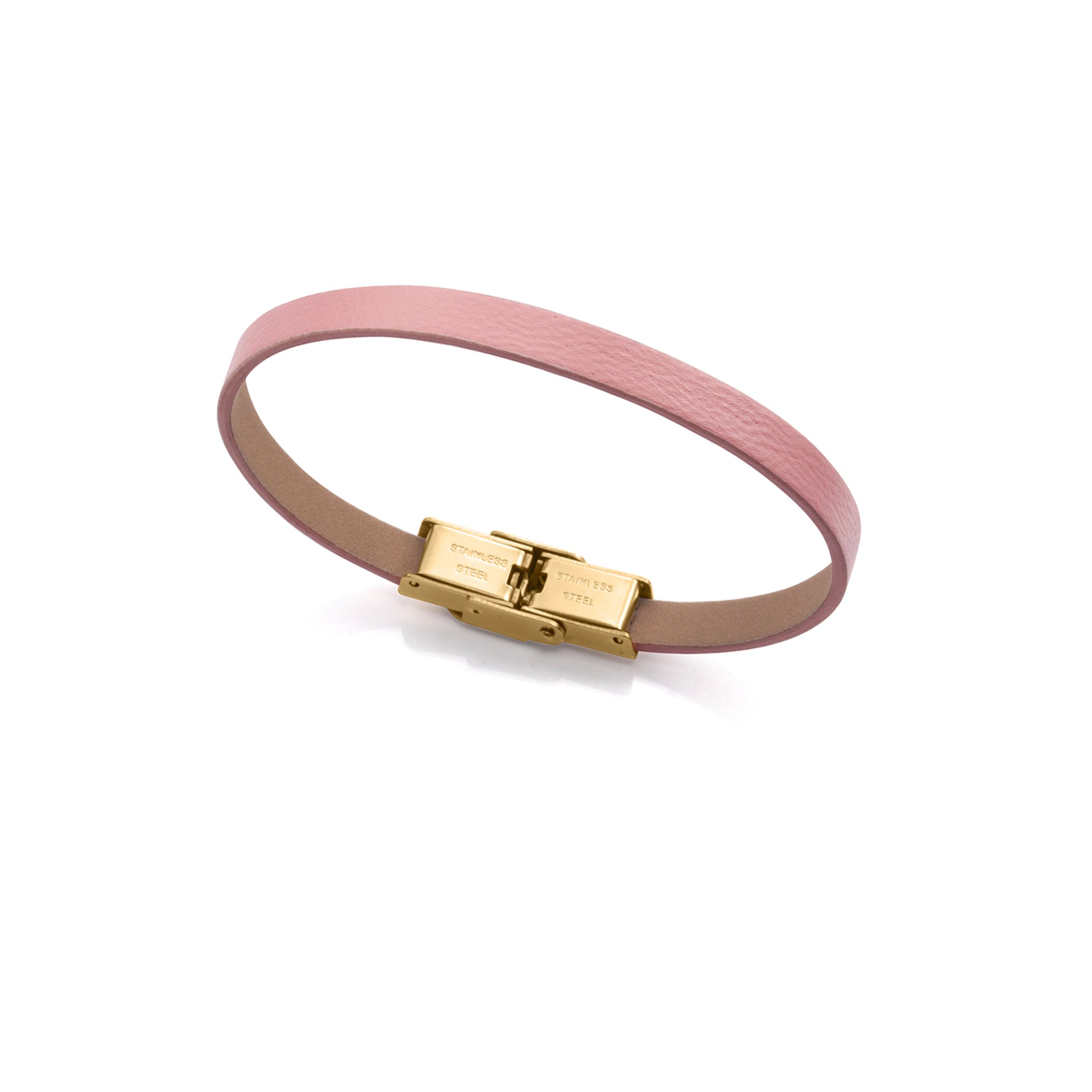 Pulsera de acero Ip dorado con piel rosa