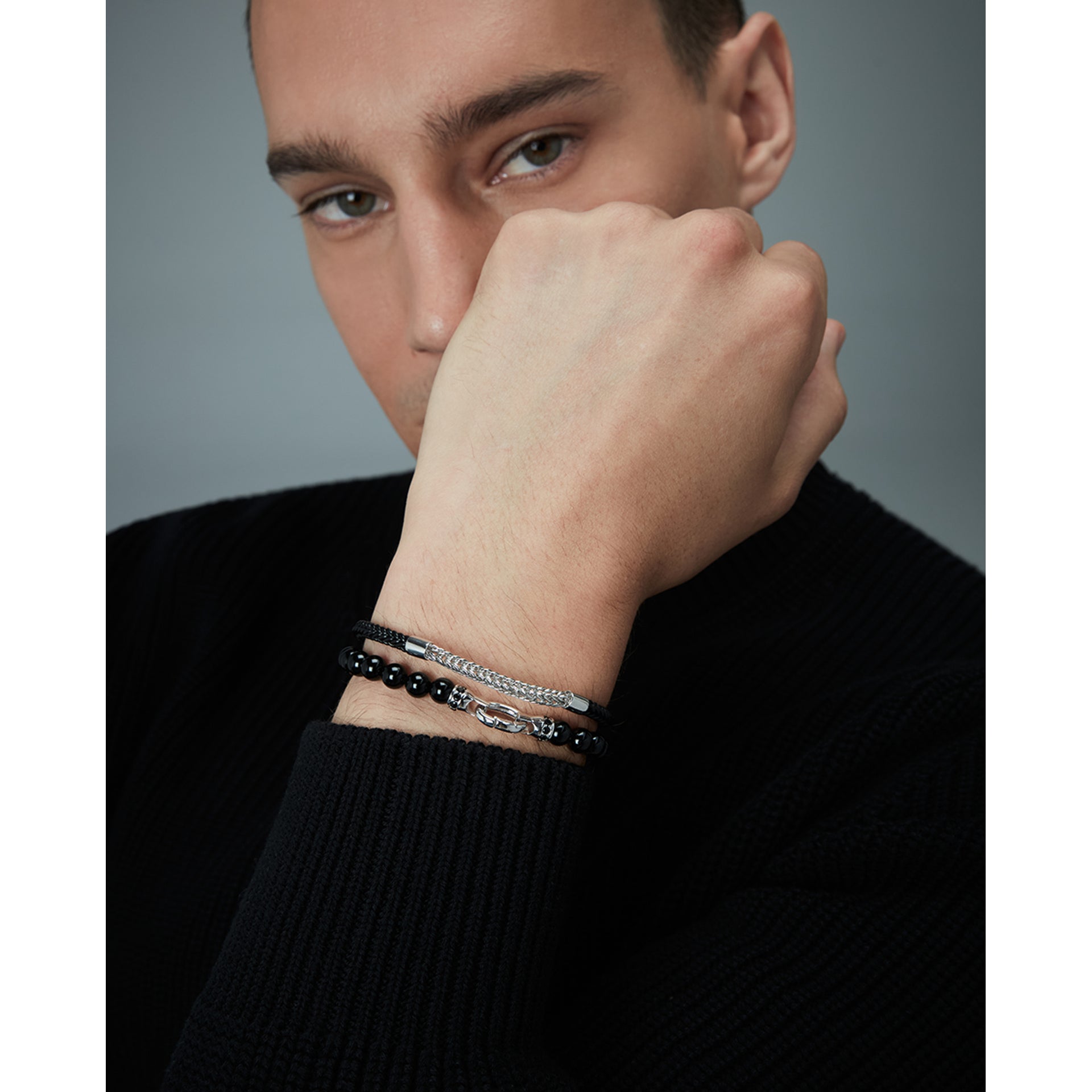 Pulsera de plata de primera ley con baño de rodio y con piel negra