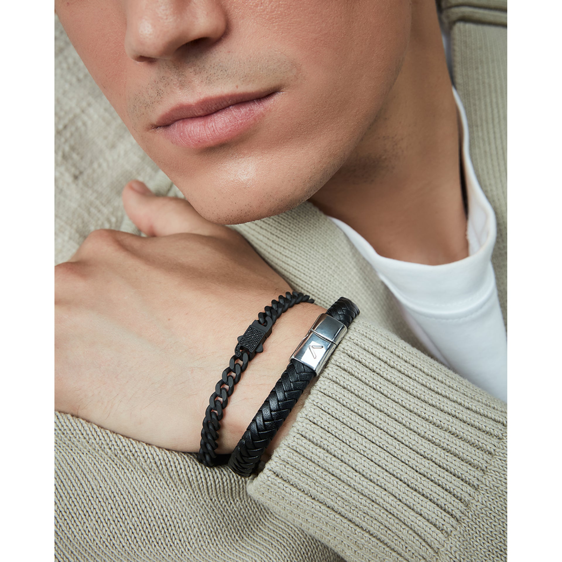 Pulsera de hombre de acero y piel negra con diseño en Ip negro