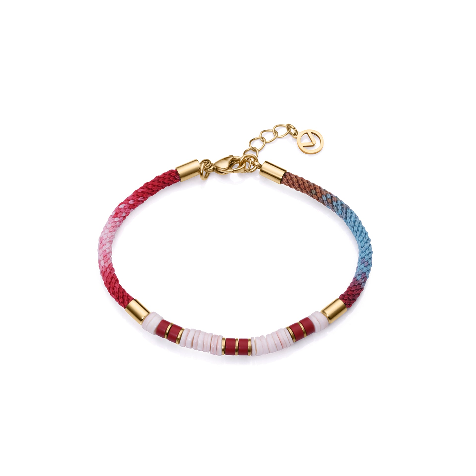 Pulsera Kiss de acero Ip dorado y cordón multicolor con piedras rojas sintéticas y naturales