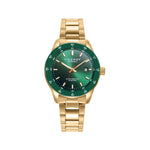 Reloj caja de acero Ip dorado con bisel cerámico verde 5 atm y brazalete acero Ip dorado con movimiento cuarzo