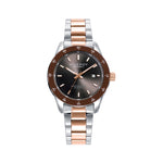 Reloj caja de acero con bisel cerámico marrón 5 atm y brazalete bicolor acero Ip rosa con movimiento cuarzo