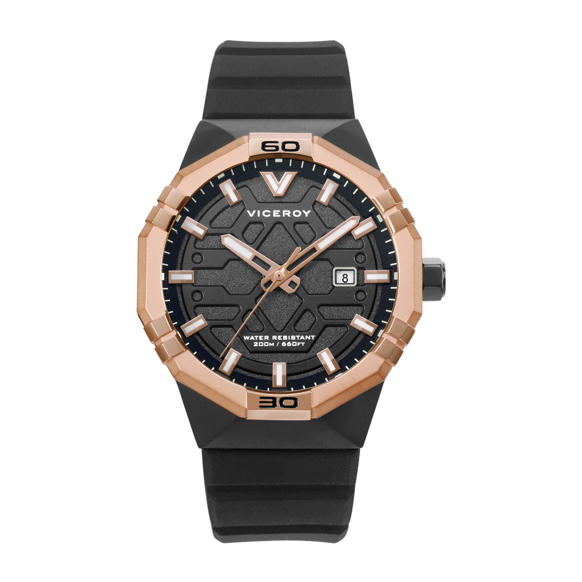 Reloj caja bitono de acero Ip negro e Ip rosa 20 Atm, correa de silicona negra, movimiento cuarzo