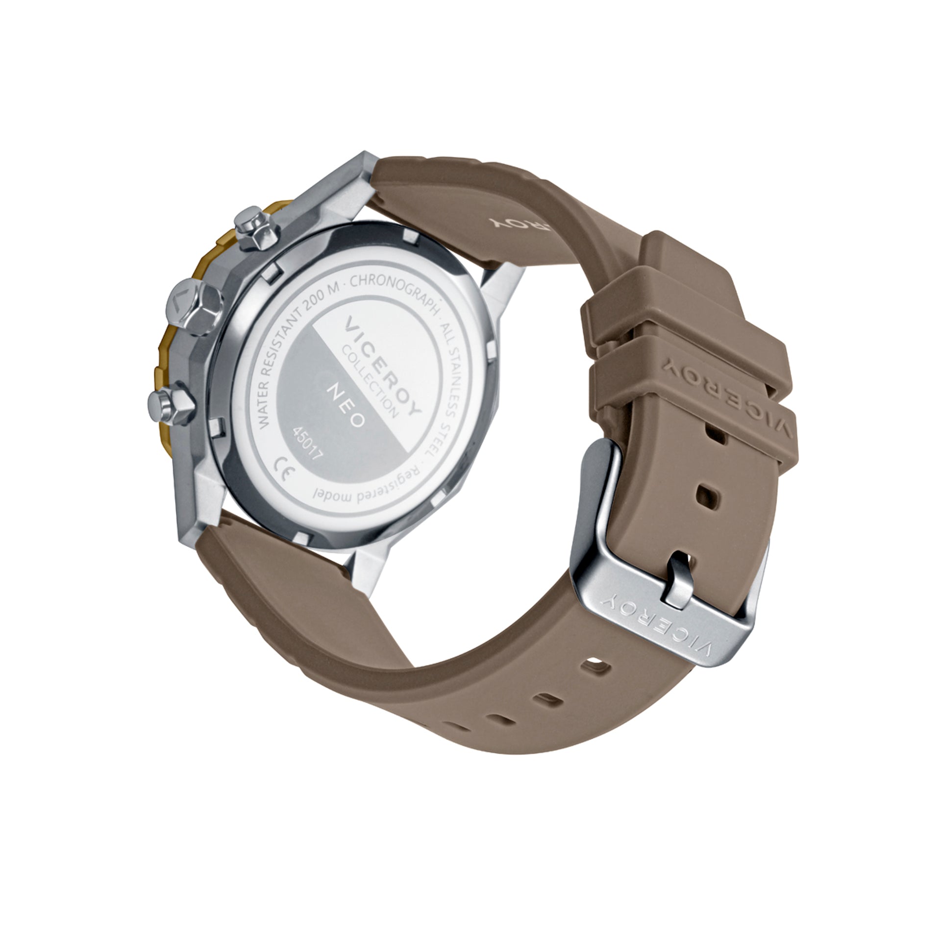 Reloj caja bitono de acero e Ip dorado 20 Atm, correa de silicona gris, movimiento cuarzo