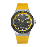 Reloj caja bitono de acero e Ip negro 20 Atm, correa de silicona amarilla, movimiento cuarzo