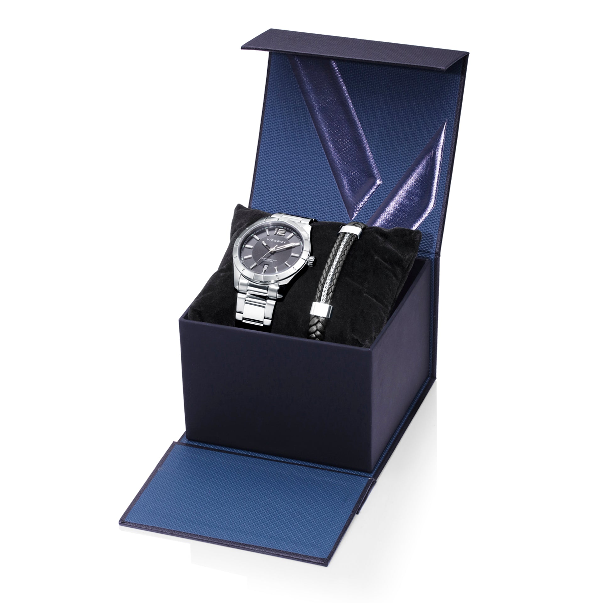 Pack de Hombre Magnum caja y brazalete de acero, y pulsera de piel negra y acero trenzado