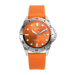 Reloj caja de aluminio naranja con bisel de acero Ip azul, 5 atm, correa de silicona naranja, movimiento de cuarzo