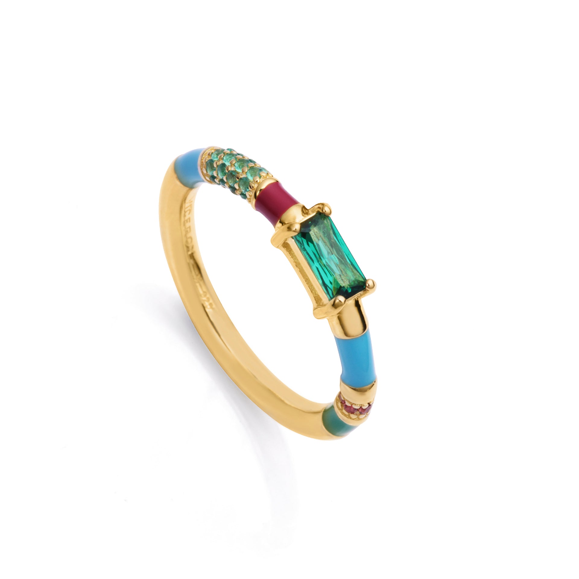 Anillo Elegant de plata de ley bañado en oro con baguette verde circonitas y esmalte de colores