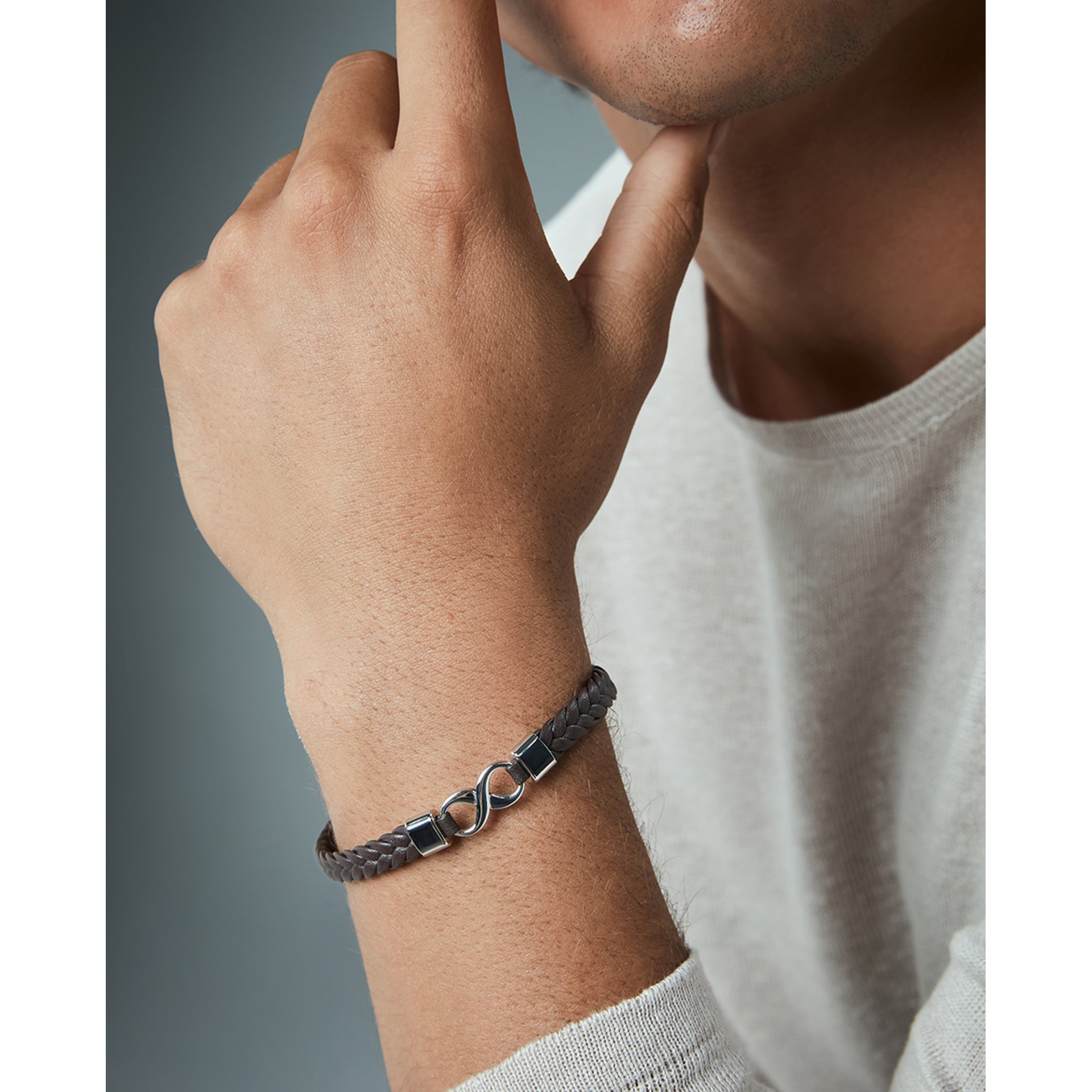 Pulsera de hombre de acero y piel marrón trenzada con cordón beige
