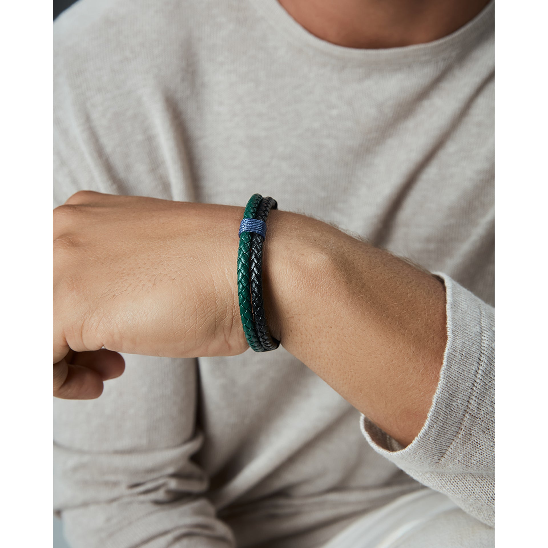 Pulsera de hombre doble de acero y piel trenzada negra y verde