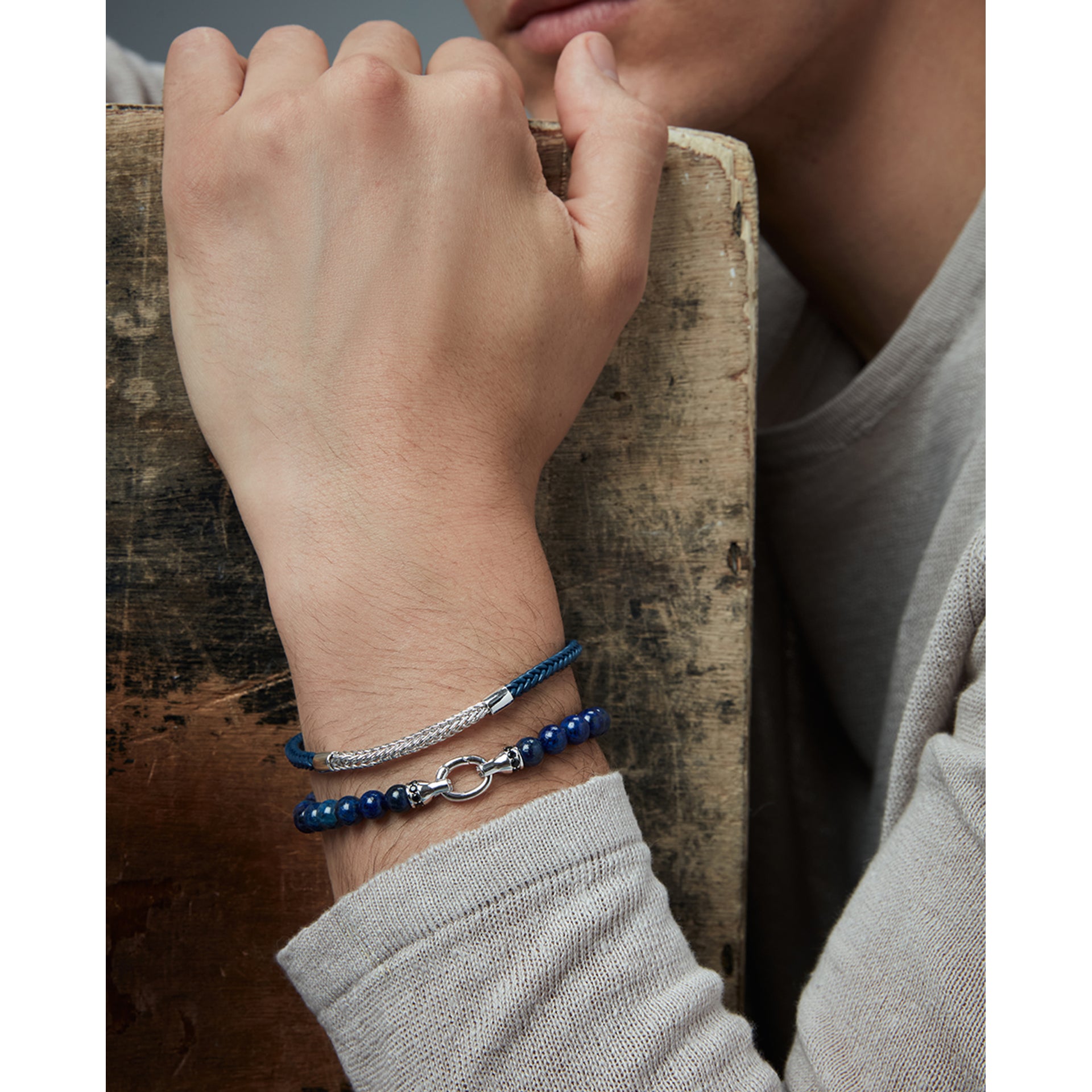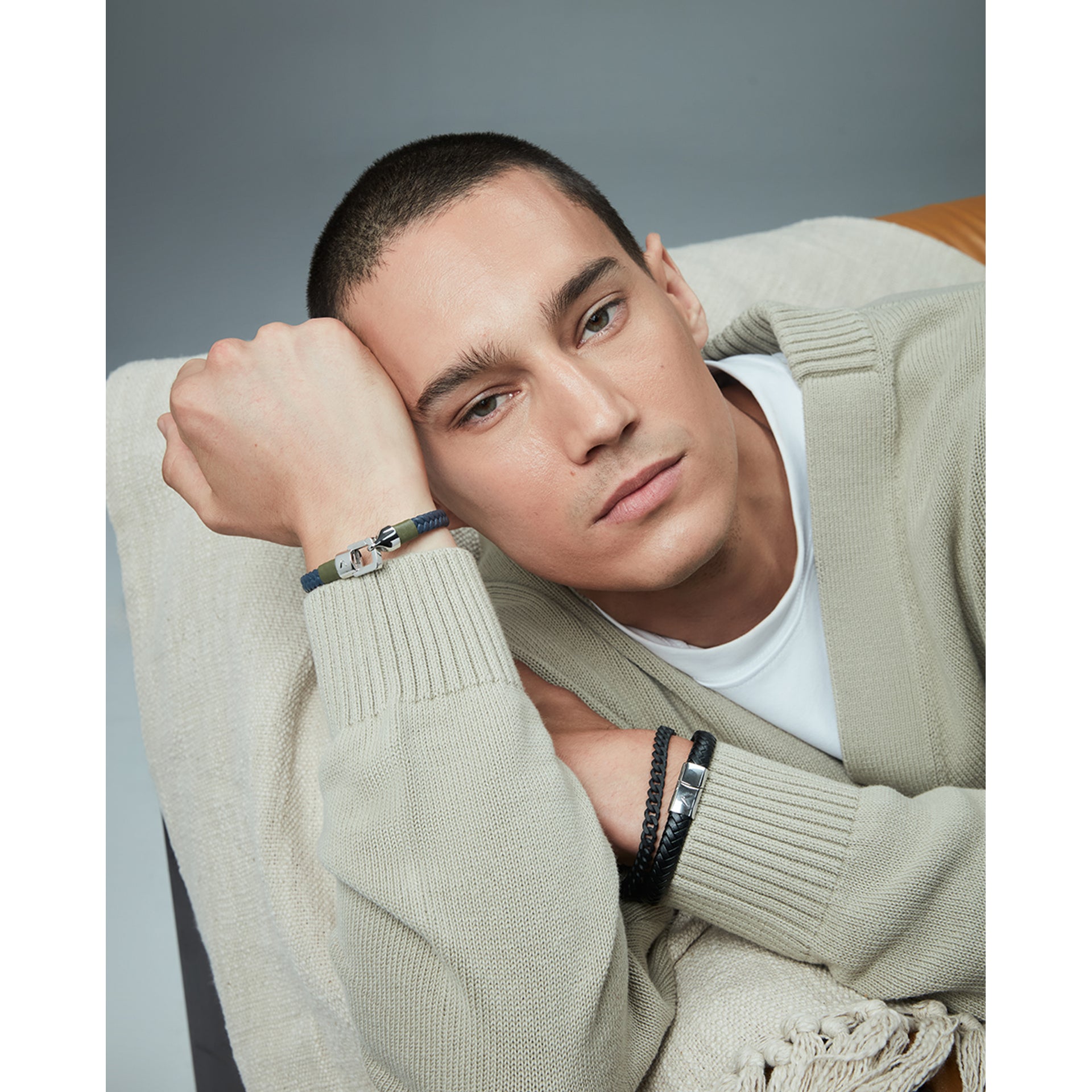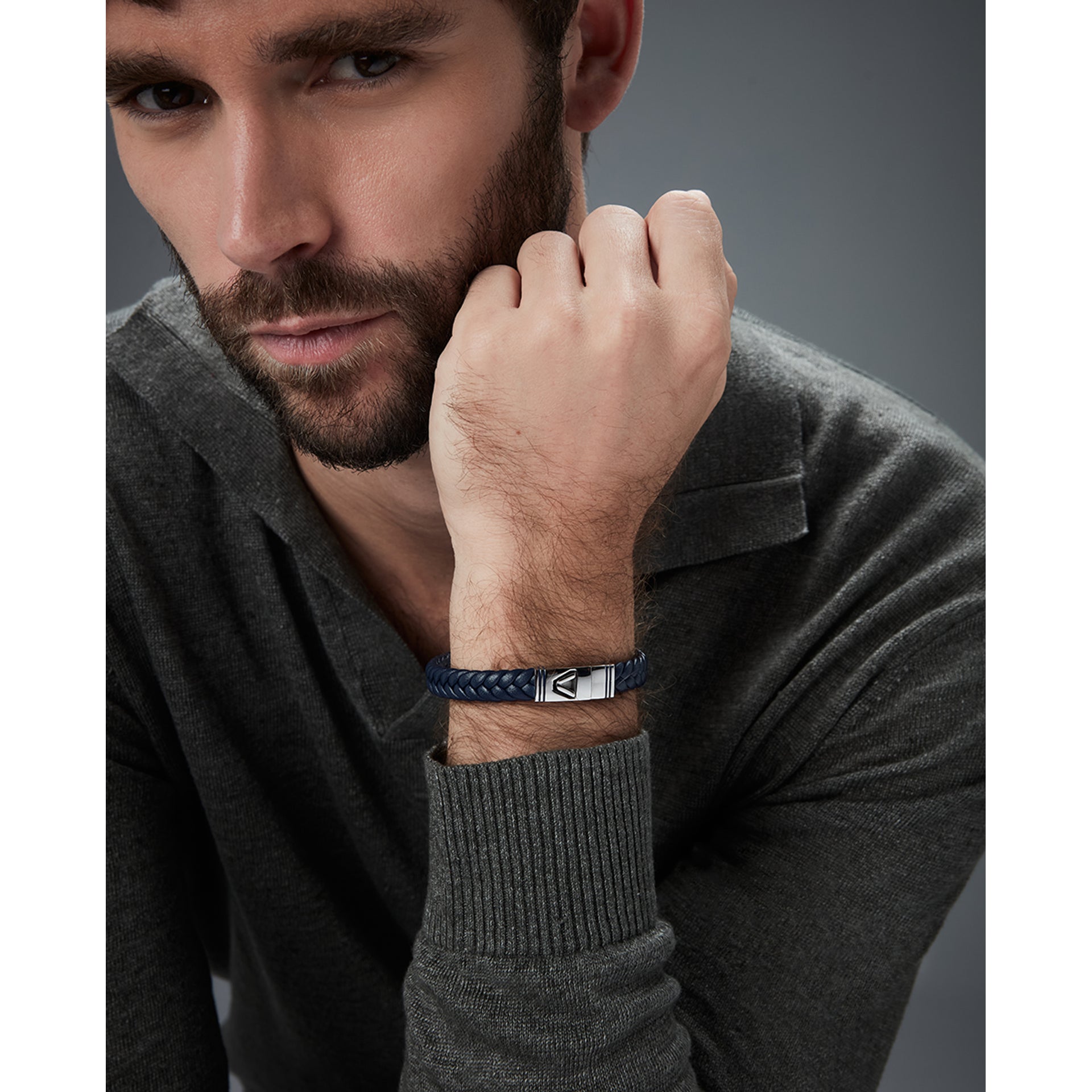 Pulsera de hombre de acero y piel azul trenzada con esmalte azul