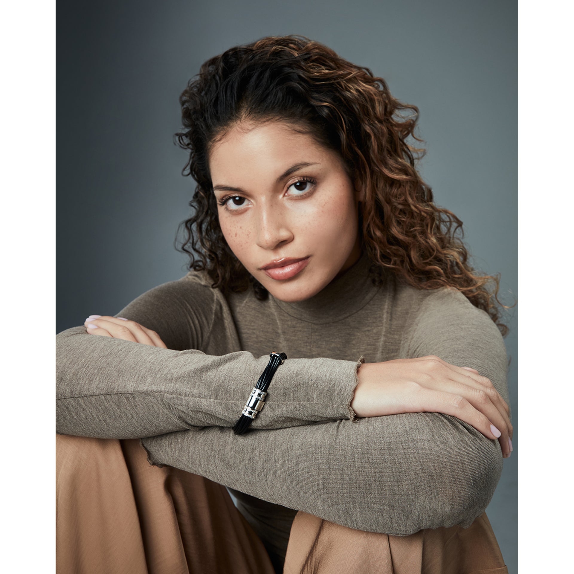 Pulsera de mujer de acero Ip negro y dorado múltiples cables unidos con barra con circonitas