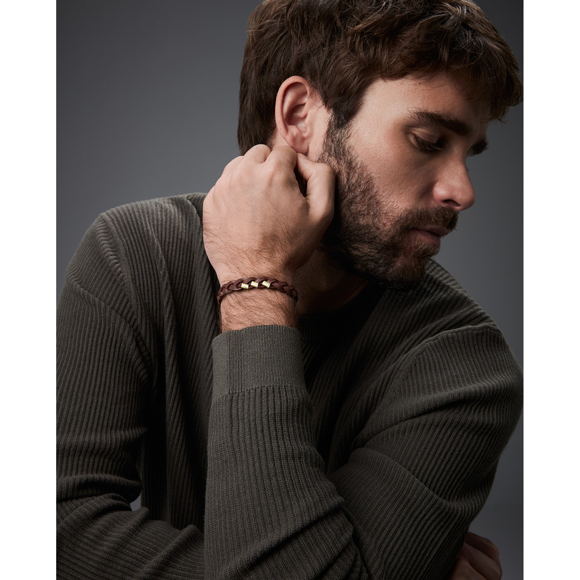 Pulsera de hombre de acero y piel marrón trenzada con cordón beige
