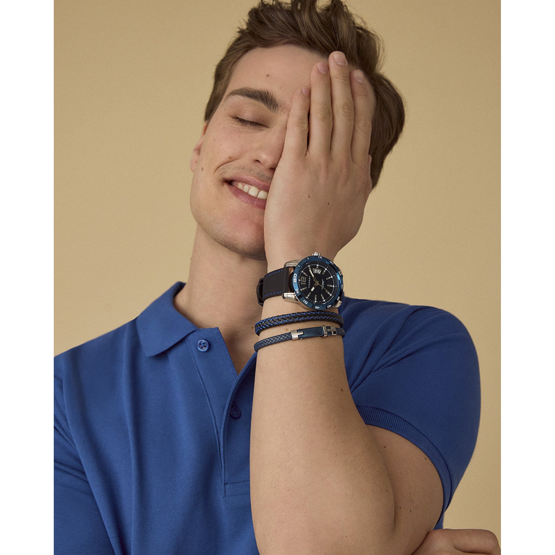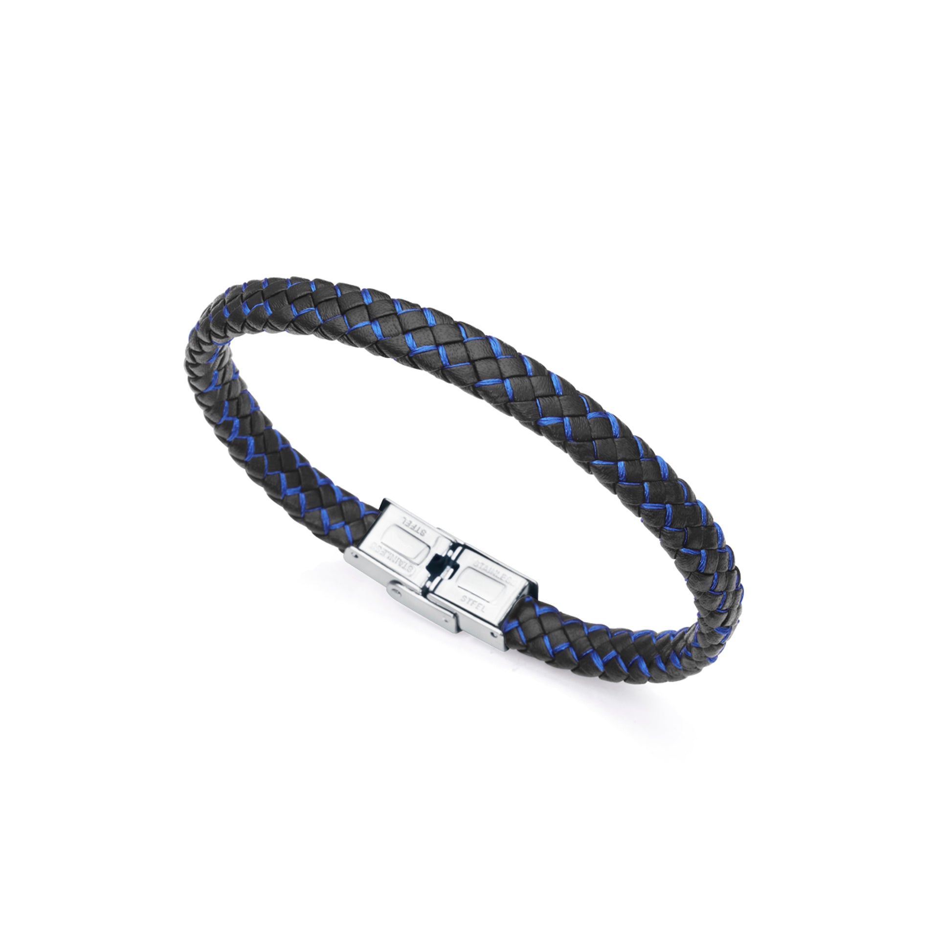 Pulsera Magnum de acero con piel trenzada negra y azul