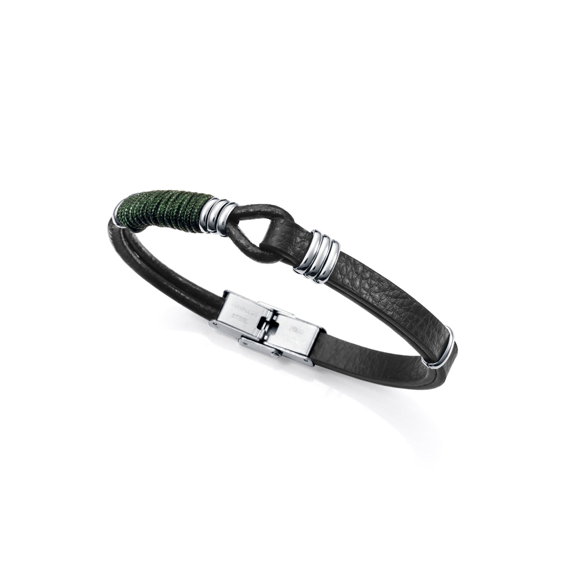 Pulsera de hombre doble de acero y piel trenzada negra y verde
