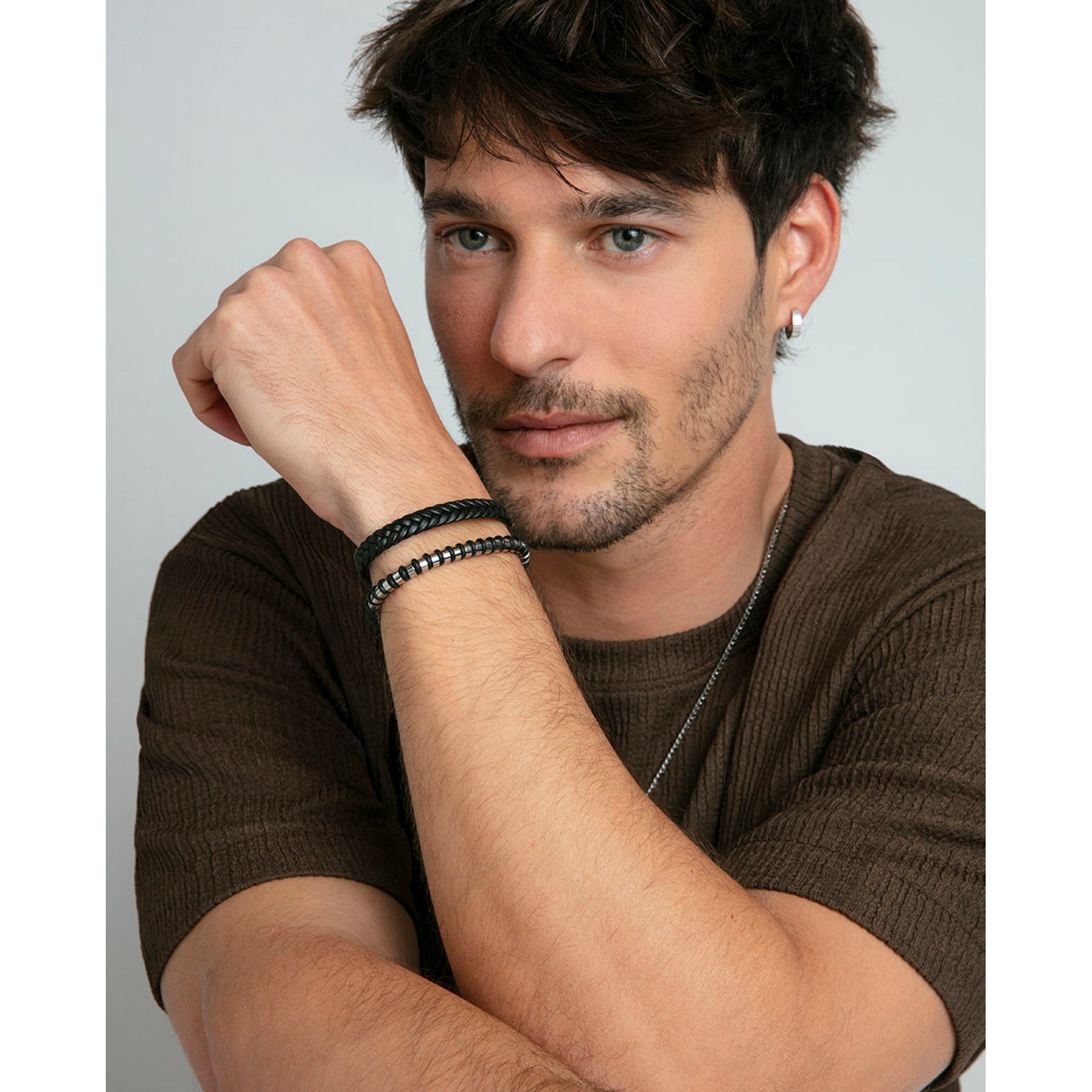 Pulsera de hombre de acero y piel trenzada marrón