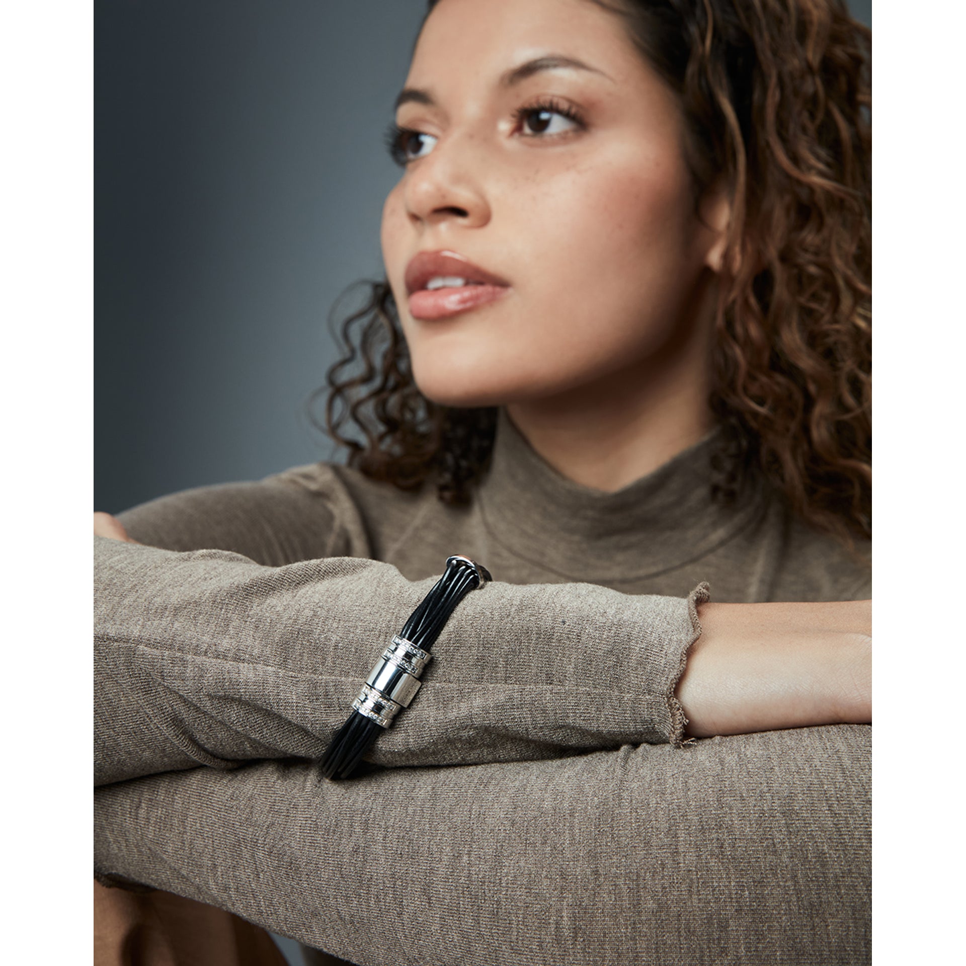 Pulsera de mujer de acero y piel negra con circonitas blancas