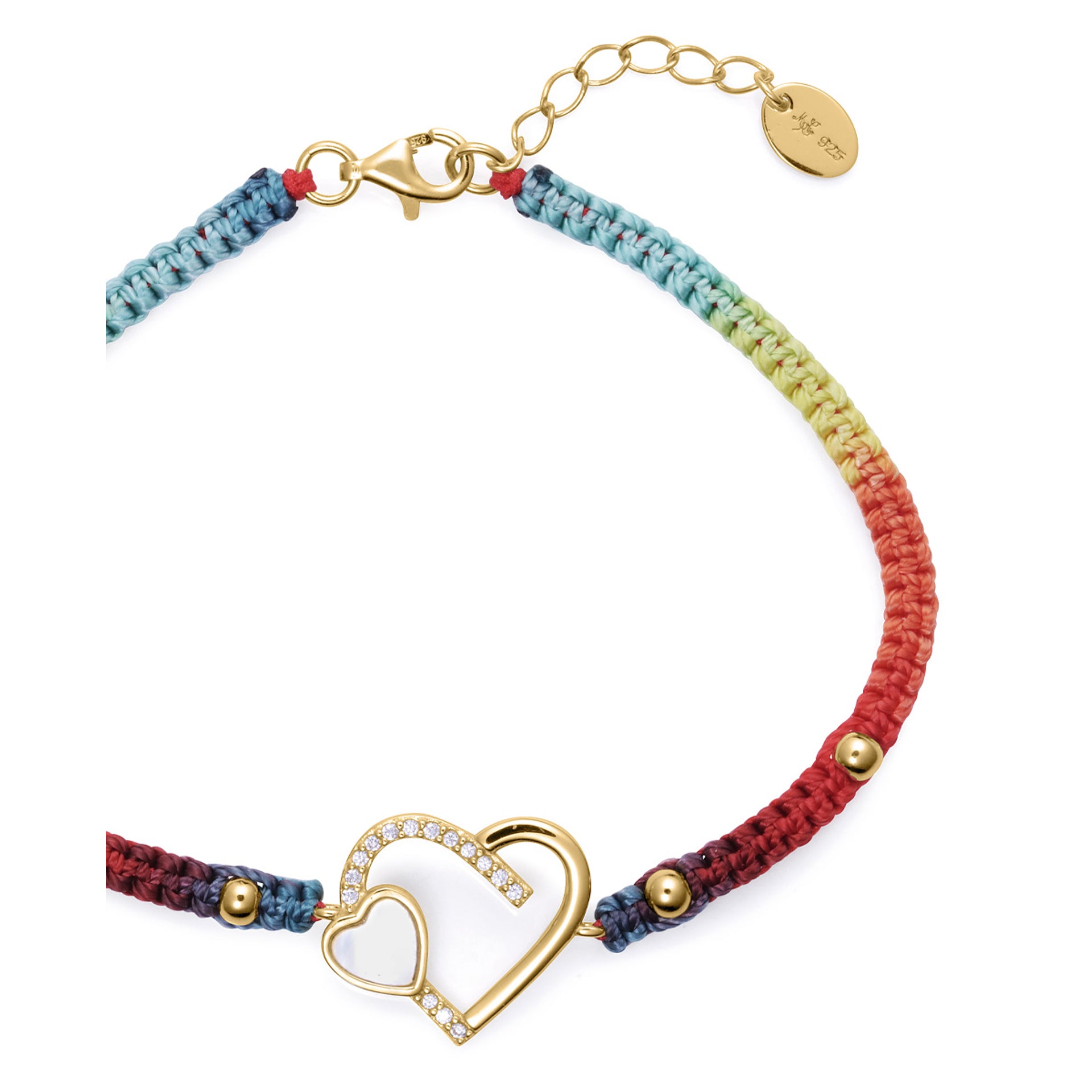 Pulsera de plata de primera ley con baño de oro y macramé de colores con corazón de motivo