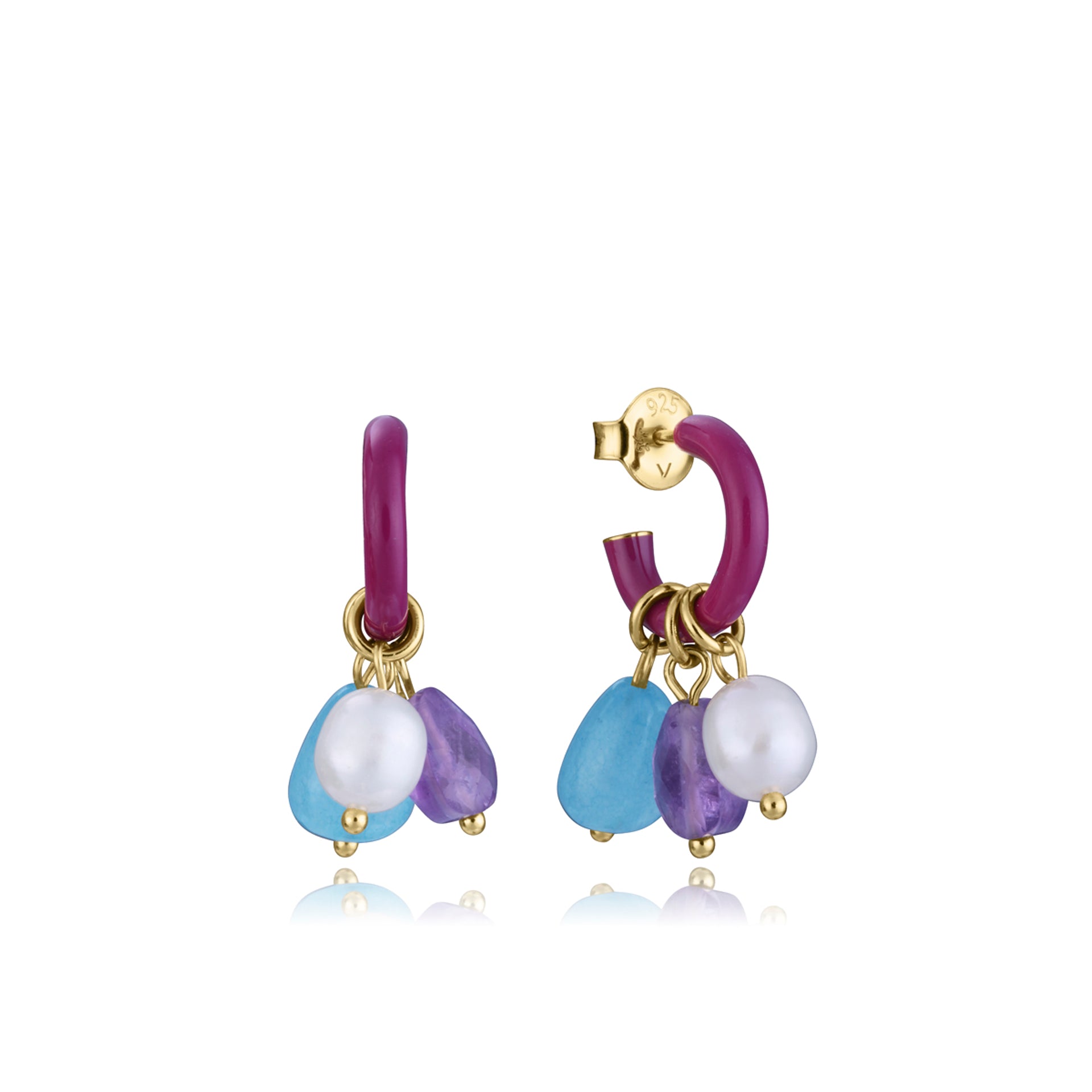 Pendientes de plata de primera ley con baño de oro, aro con esmalte y piedras colgantes naturales