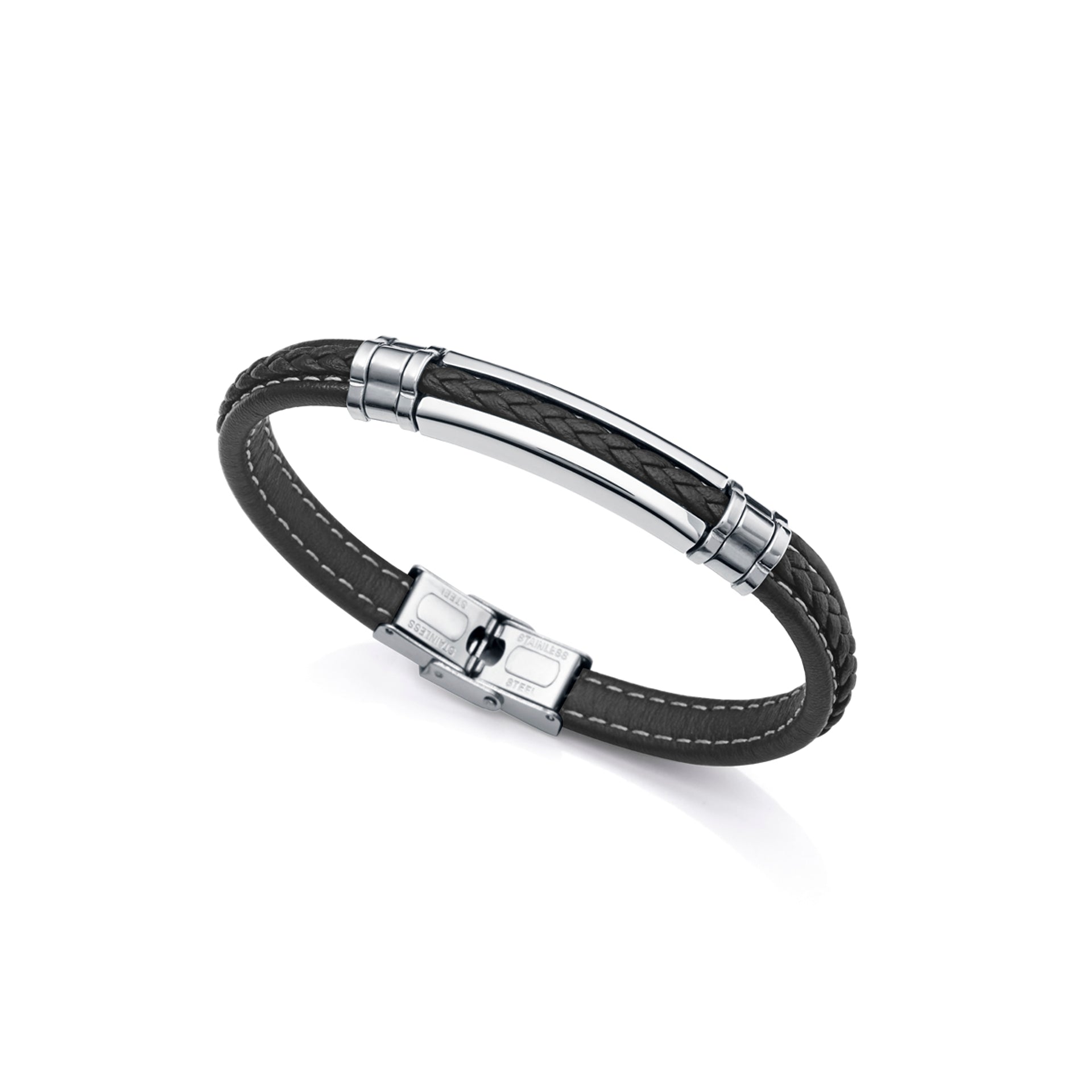 Herrenarmband aus Stahl und schwarzem Leder
