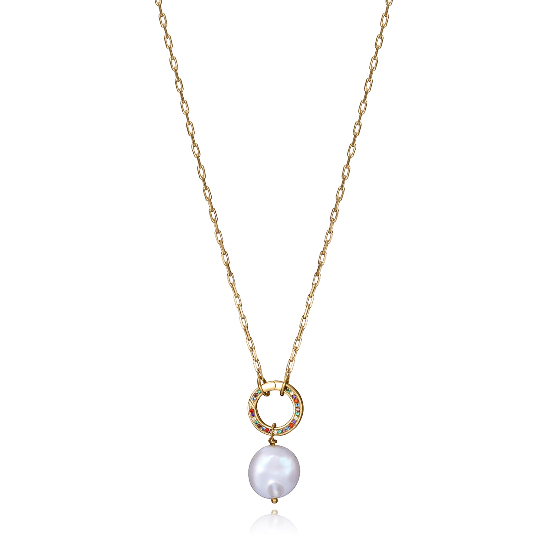 Elegante goldene Halskette aus Sterlingsilber mit buntem Zirkonia-Reifen und Zuchtperlenanhänger