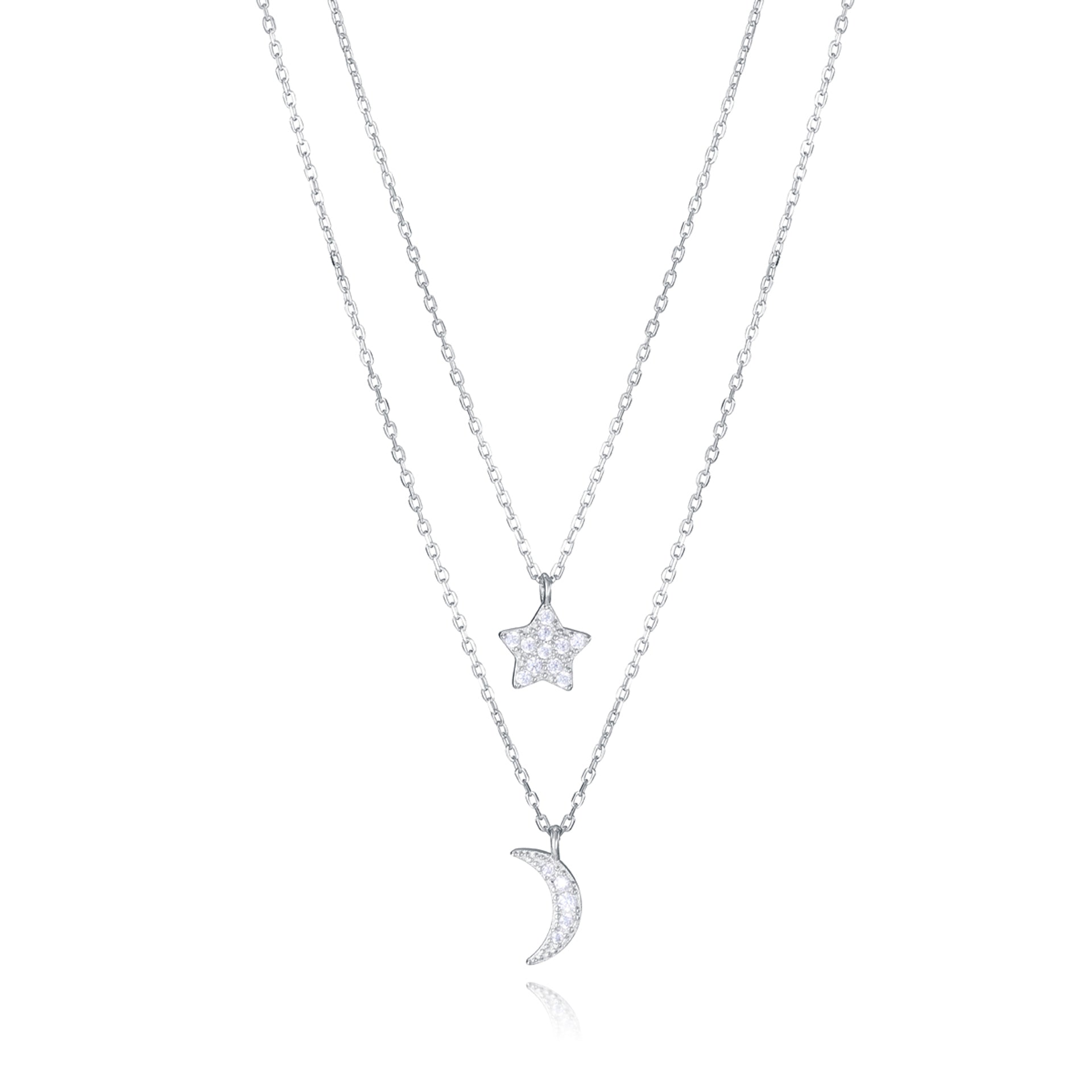 Doppelte Halskette aus Sterlingsilber mit Stern- und Mondanhängern und weißen Zirkonen