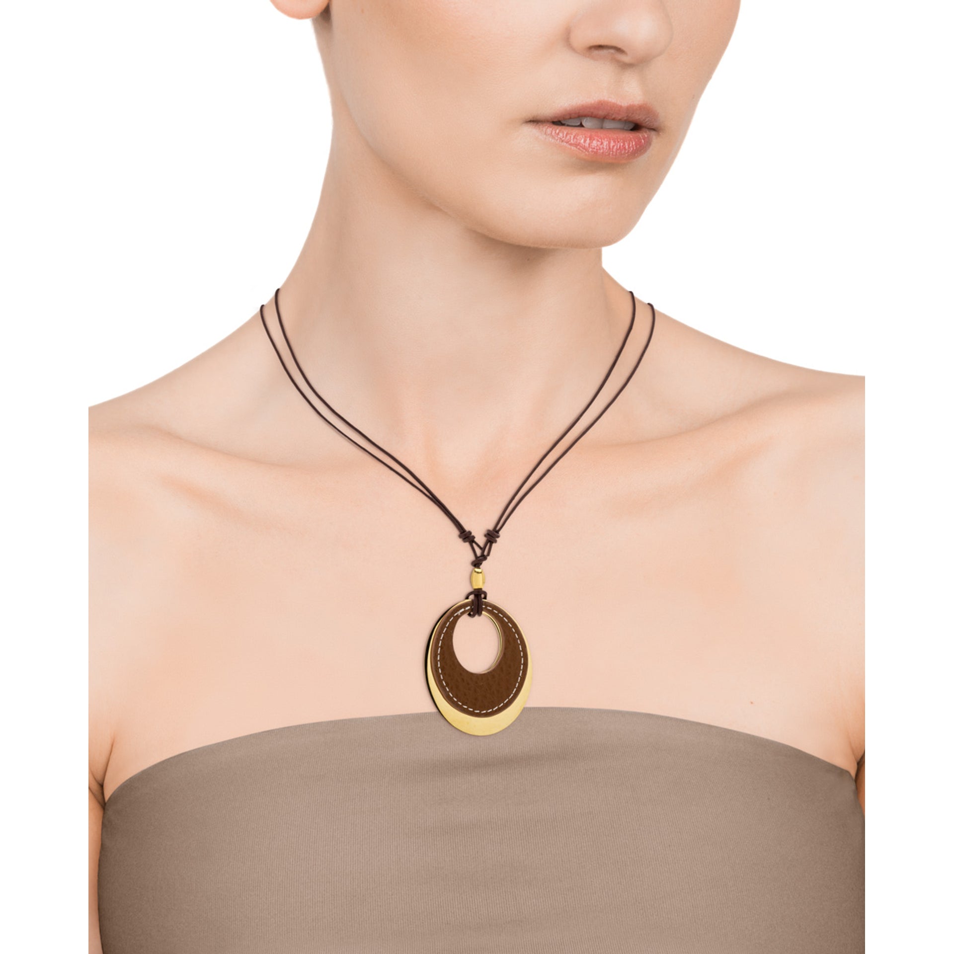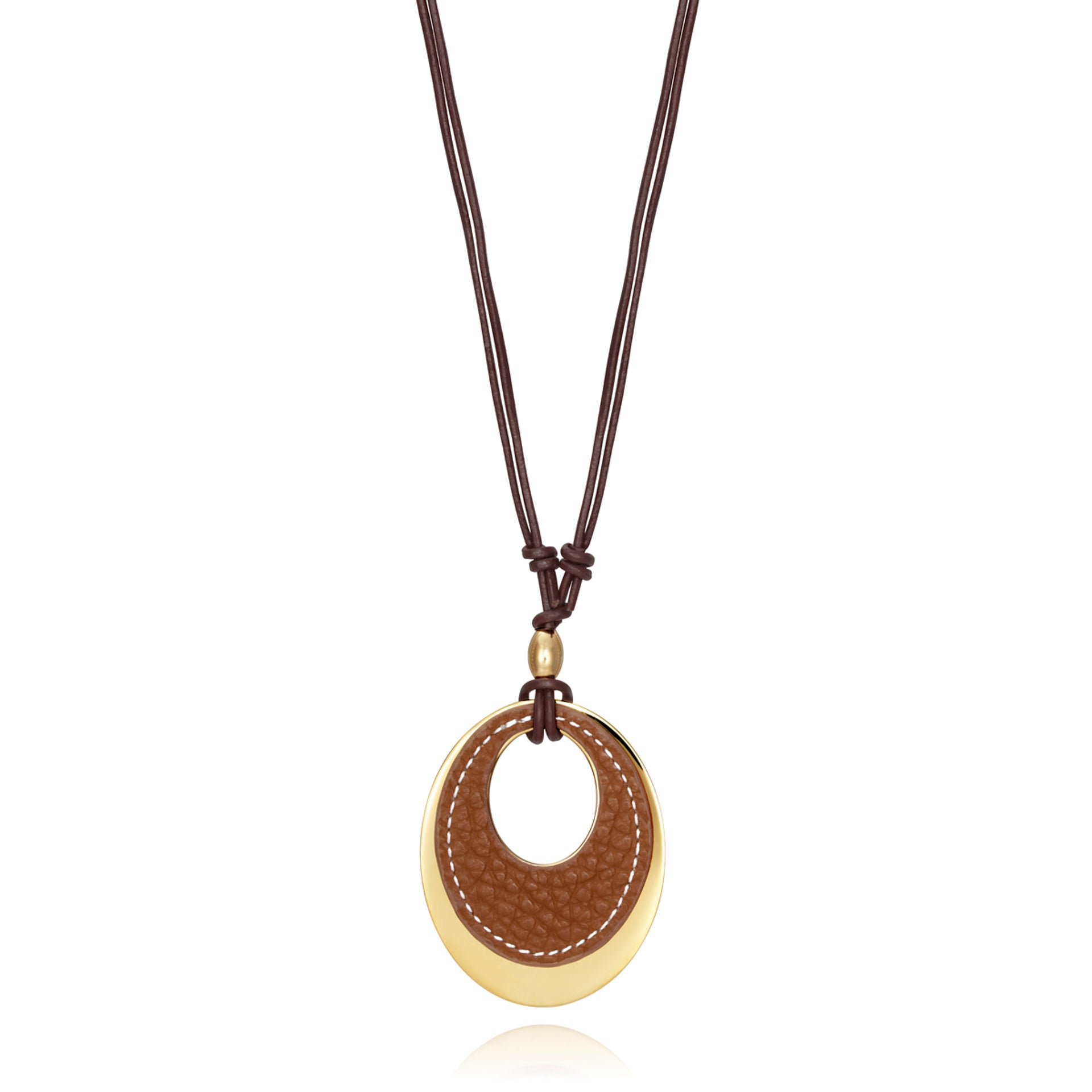 Colgante Chic de acero IP dorado y piel marrón