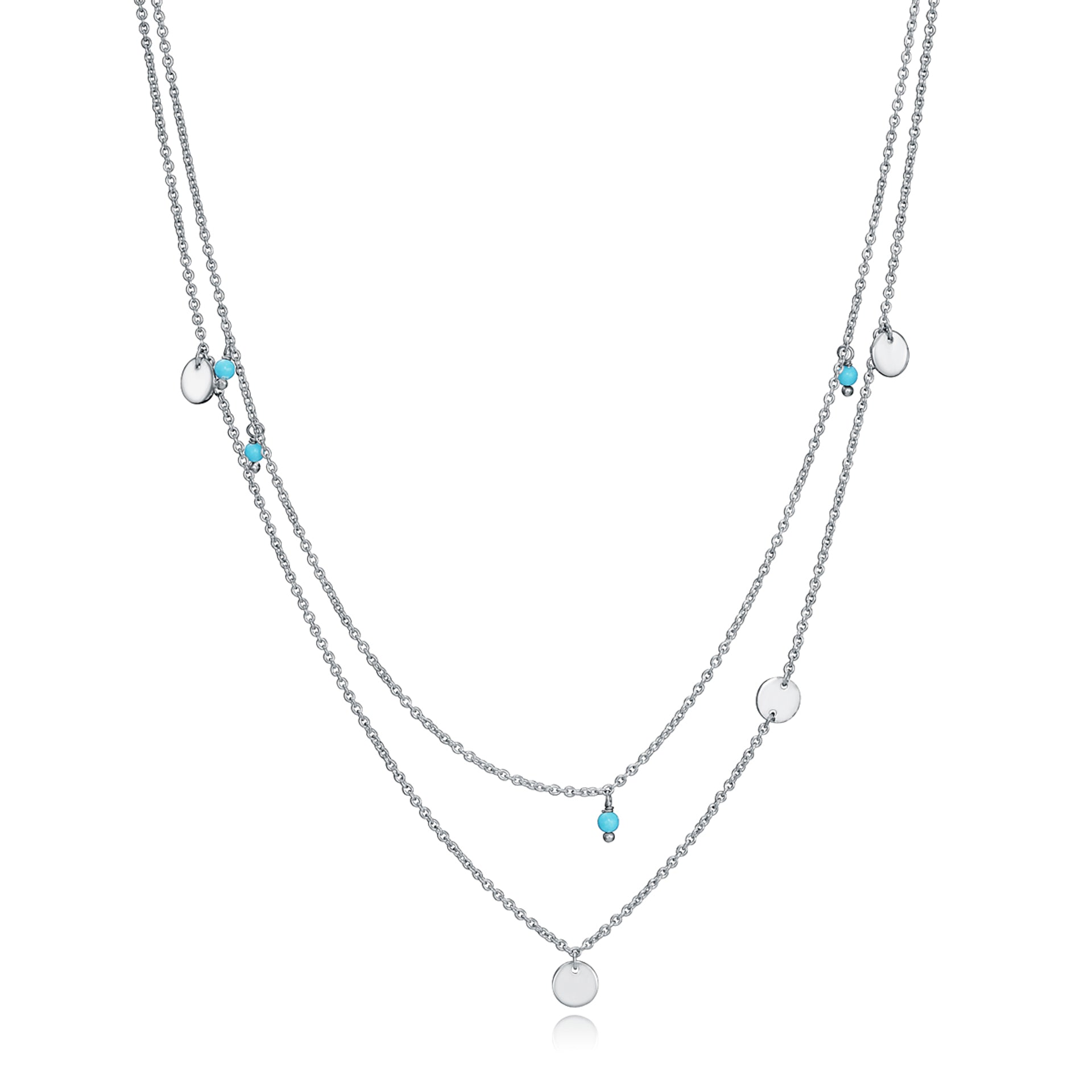 Trendige Halskette aus doppelt rhodiniertem Sterlingsilber mit Scheiben und türkisfarbenen Steinen
