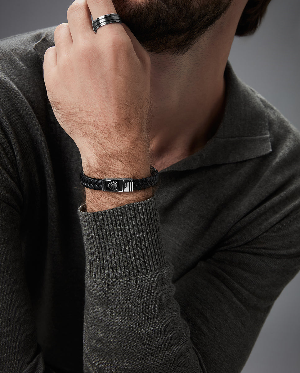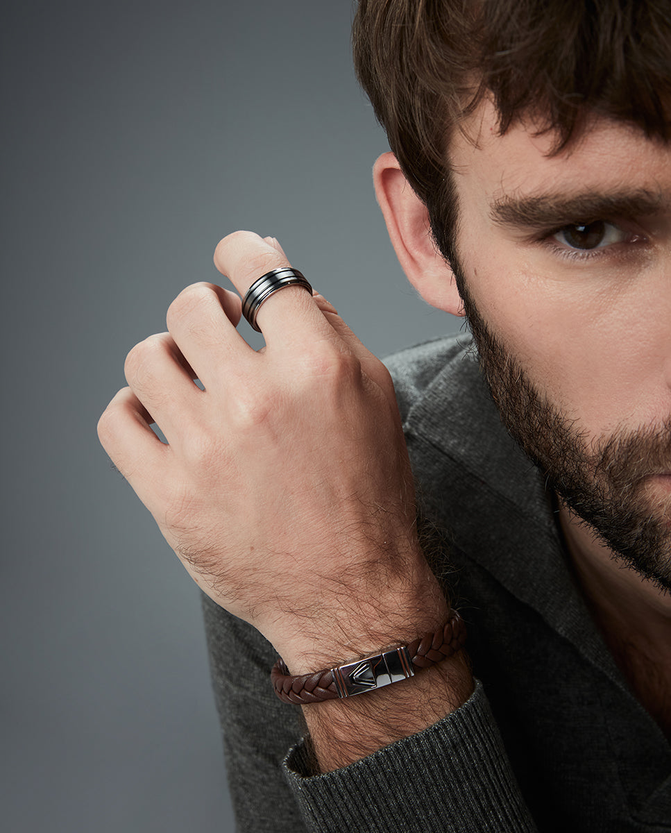 Anillo de hombre de acero combinado con dos lineas de Ip negro y gris