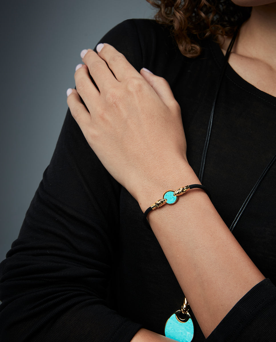 Damenkette aus vergoldetem IP-Stahl und schwarzer Kordel mit einem Wendeanhänger mit Naturstein und Perlmutt