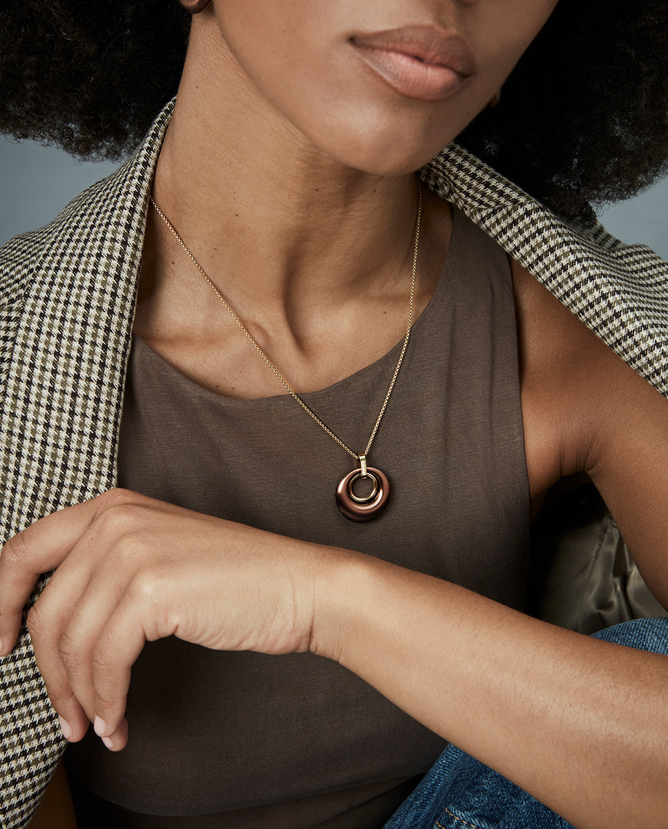 Damenhalskette aus braunem und goldenem IP-Stahl mit weißen Zirkonen und hängenden Ringen