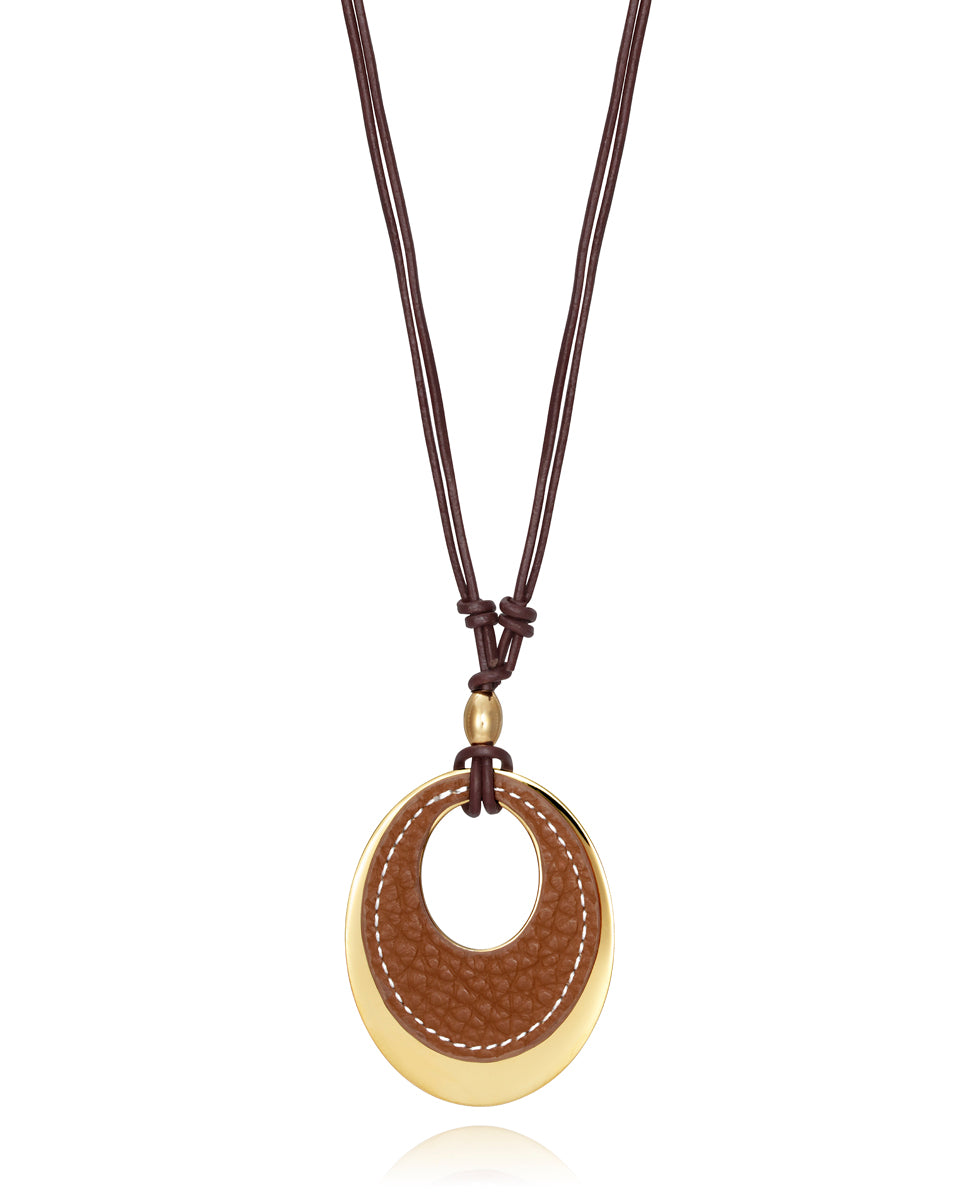 Colgante Chic de acero IP dorado y piel marrón