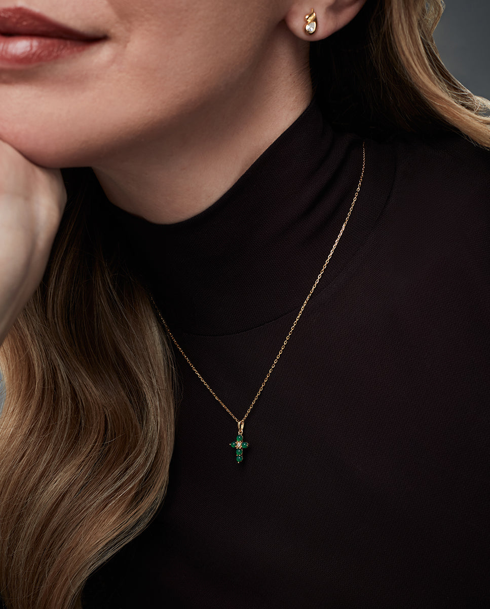 Vergoldete Halskette aus Sterlingsilber mit einem Kreuzanhänger mit natürlichem weißem Topas und grünen Achatsteinen.