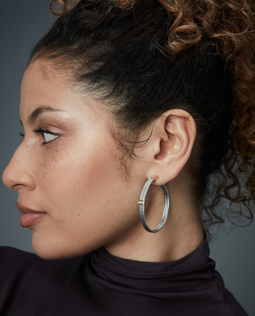 Damenohrringe aus vergoldetem IP-Stahl mit einem Doppelkabel, das mit einer Stange mit Zirkonen verbunden ist