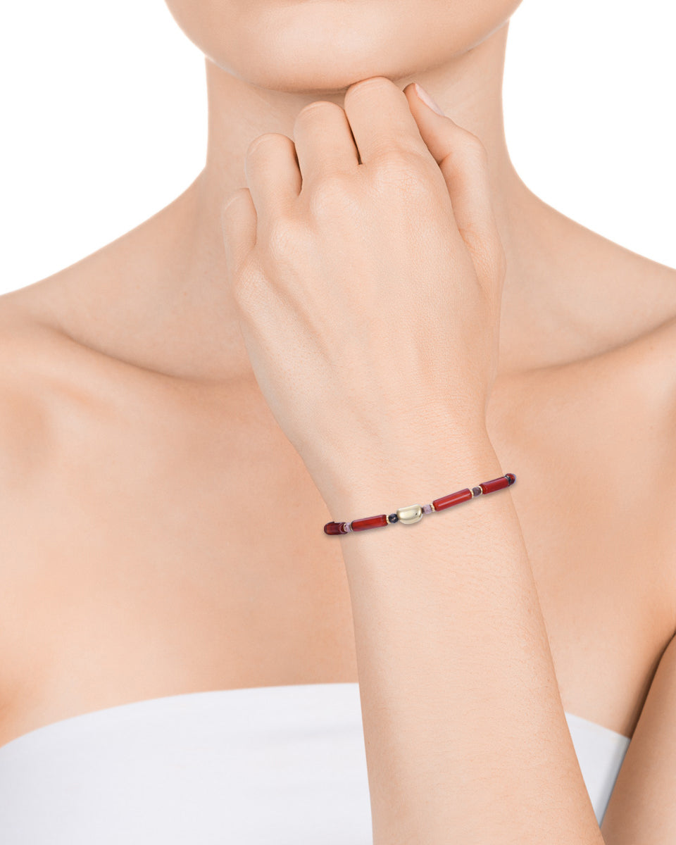 Schickes Stahlarmband in Gold Ip mit roten Karneol- und Rhodonitsteinen