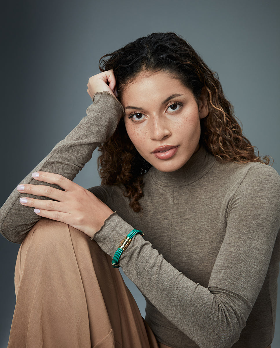 Damenarmband aus vergoldetem IP-Stahl und grünem Leder mit grünen Zirkonen