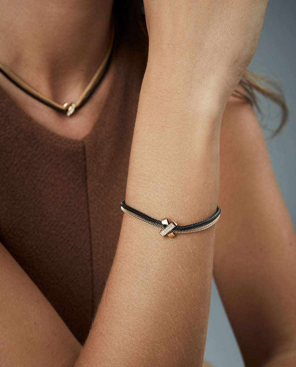 Damenarmband aus goldenem und schwarzem IP-Stahl, doppelte runde Matte mit einem X mit Zirkonen
