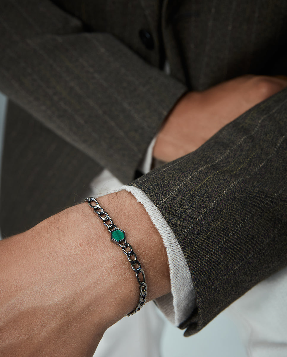 Herren-Kettenarmband aus grauem IP-Stahl mit natürlichem Malachitstein