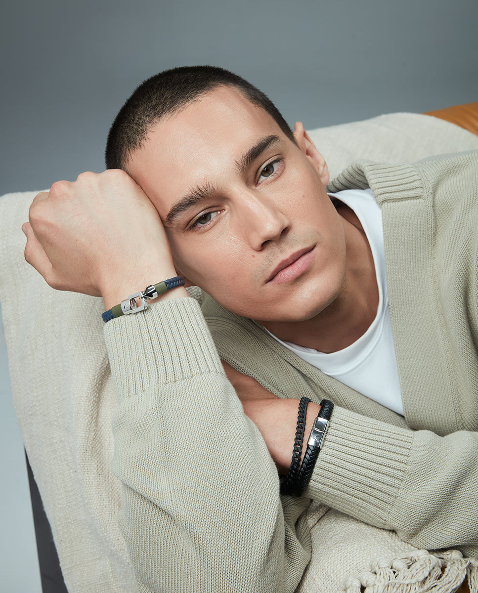 Herrenarmband aus Stahl und blauem geflochtenem Leder mit grünem Lederdetail
