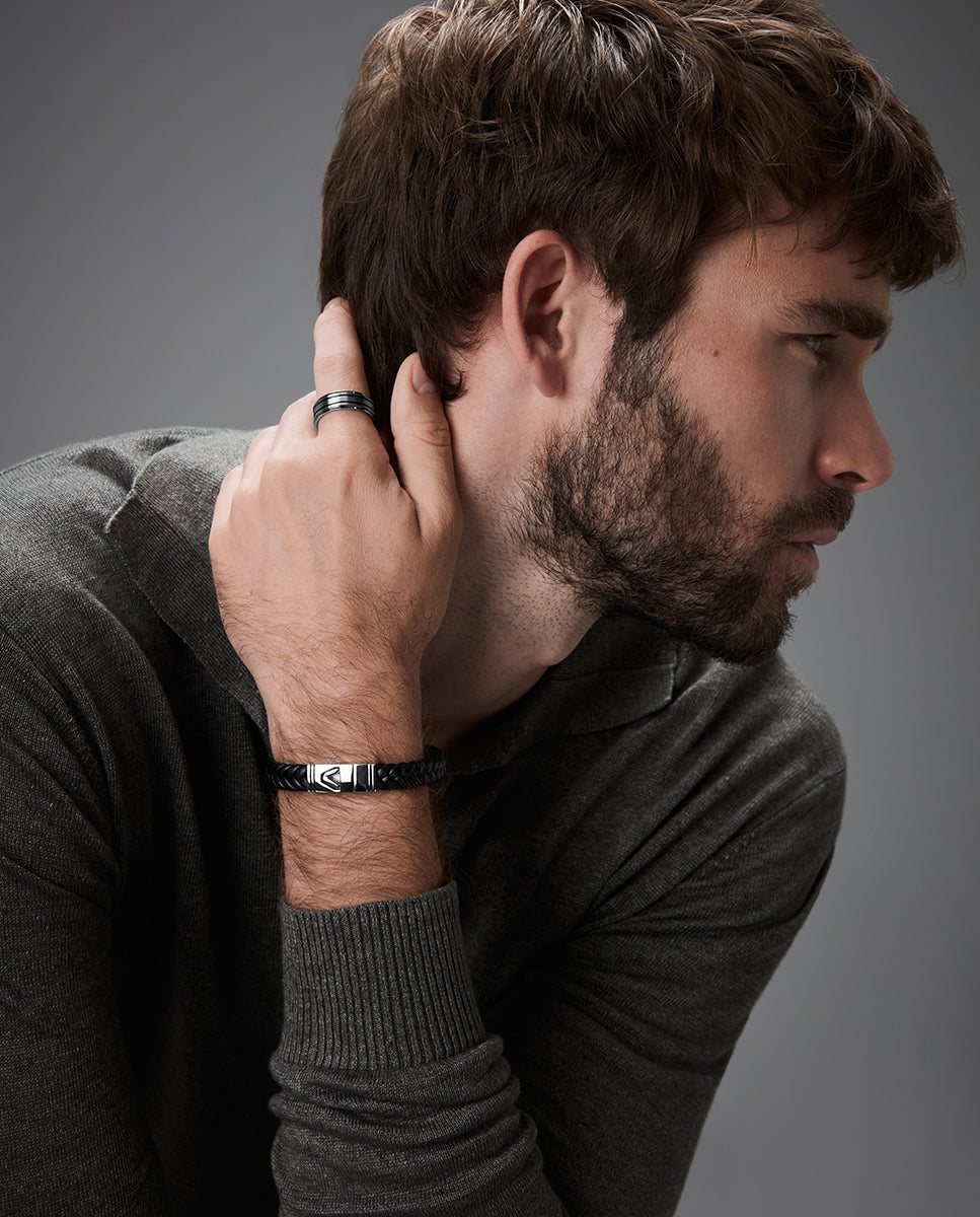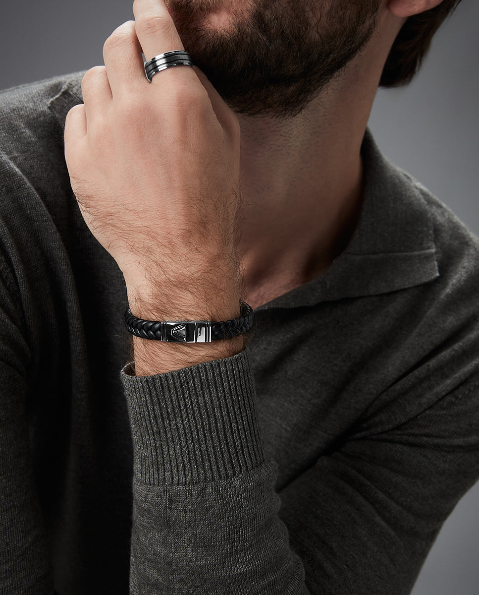 Herrenarmband aus Stahl und schwarzem Leder mit schwarzer Emaille