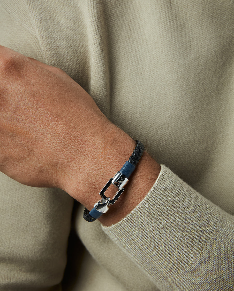 Herrenarmband aus Stahl und schwarzem geflochtenem Leder mit blauem Lederdetail