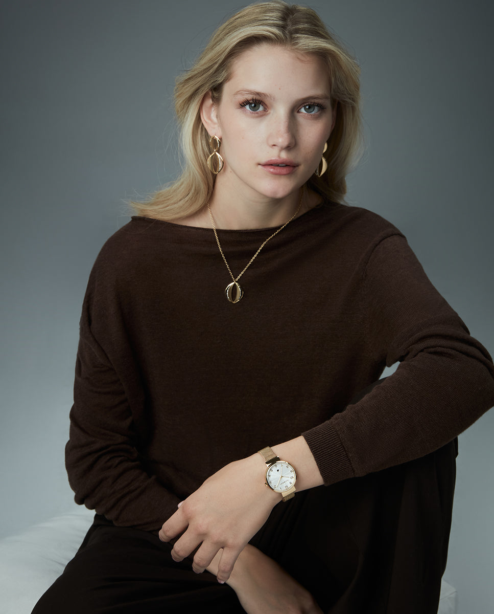 Uhr mit vergoldetem Stahl- und IP-Gehäuse, vergoldetem Milanaise-Stahlgeflecht und Quarzwerk.