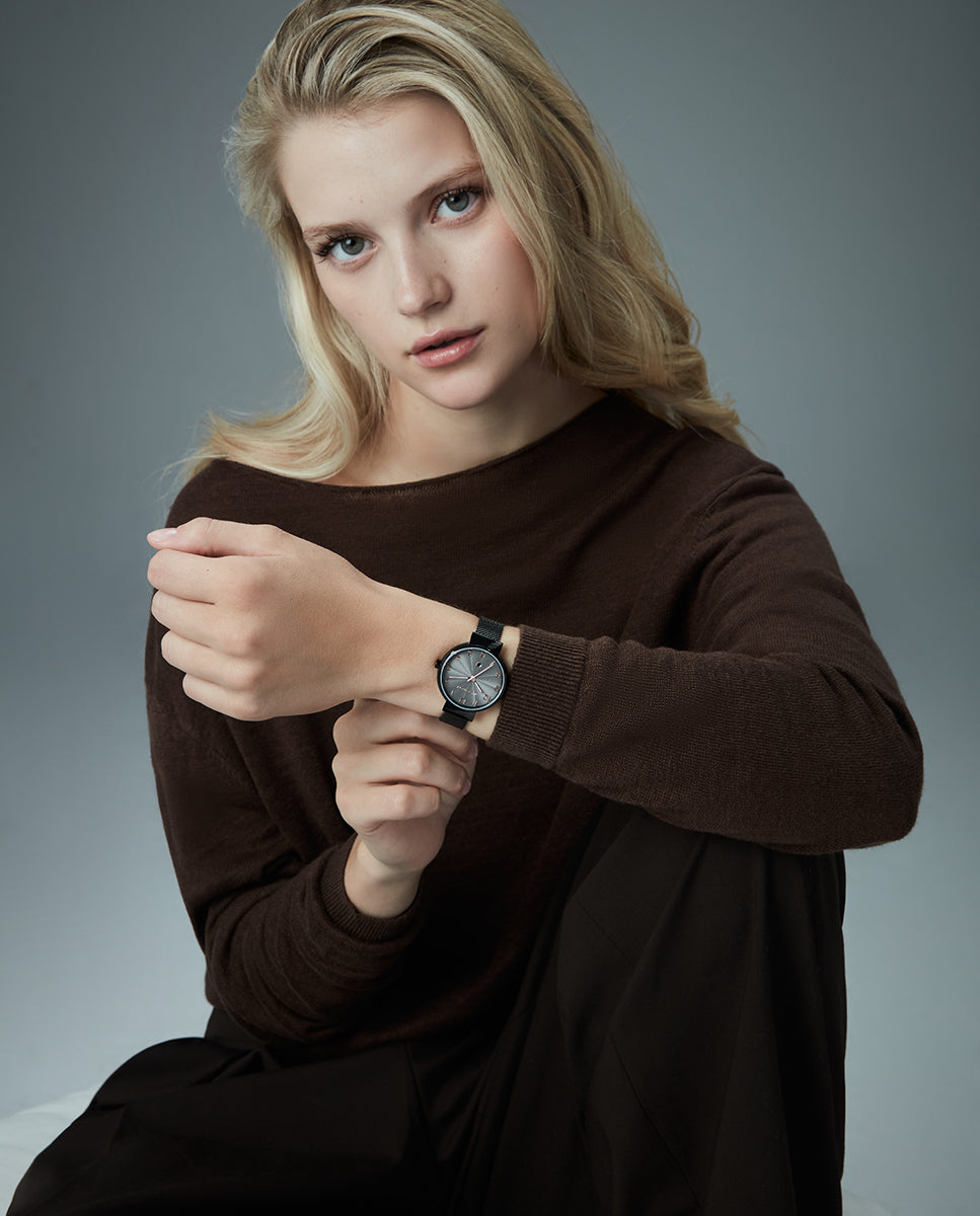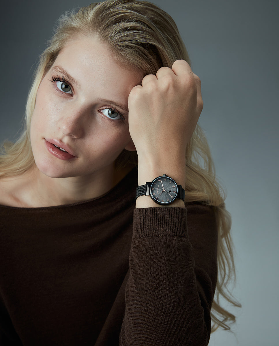 Uhr mit schwarzem IP-Stahlgehäuse, schwarzes Mailänder Mesh-Geflecht aus IP-Stahl, Quarzwerk