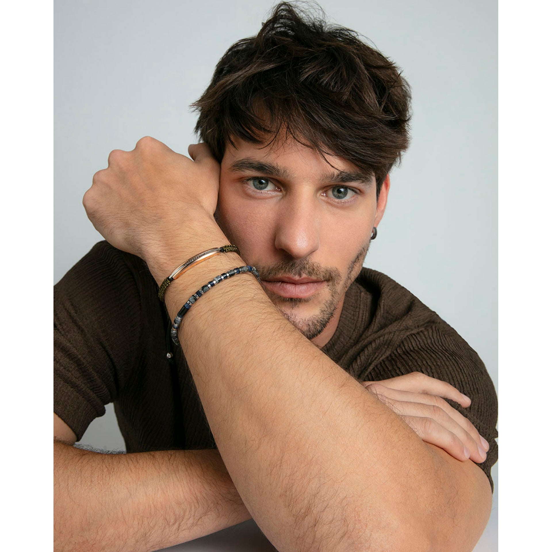 Bracelet homme partie tubulaire en acier et cuir marron