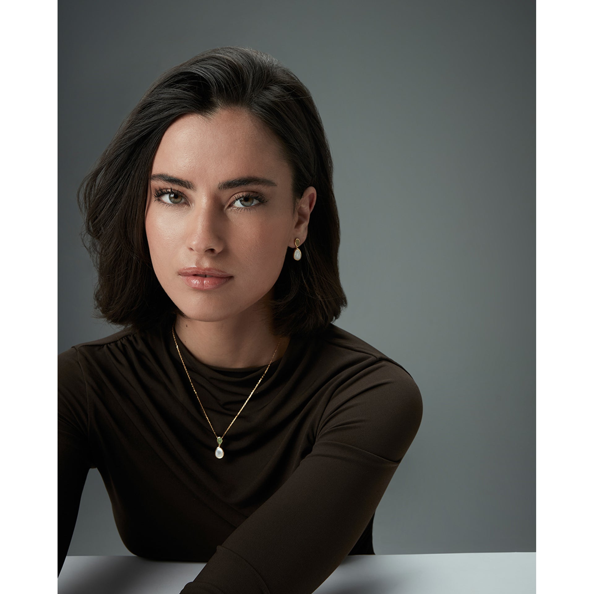 Gold-plated sterling silver necklace with green zircons and a mother-of-pearl pendant
