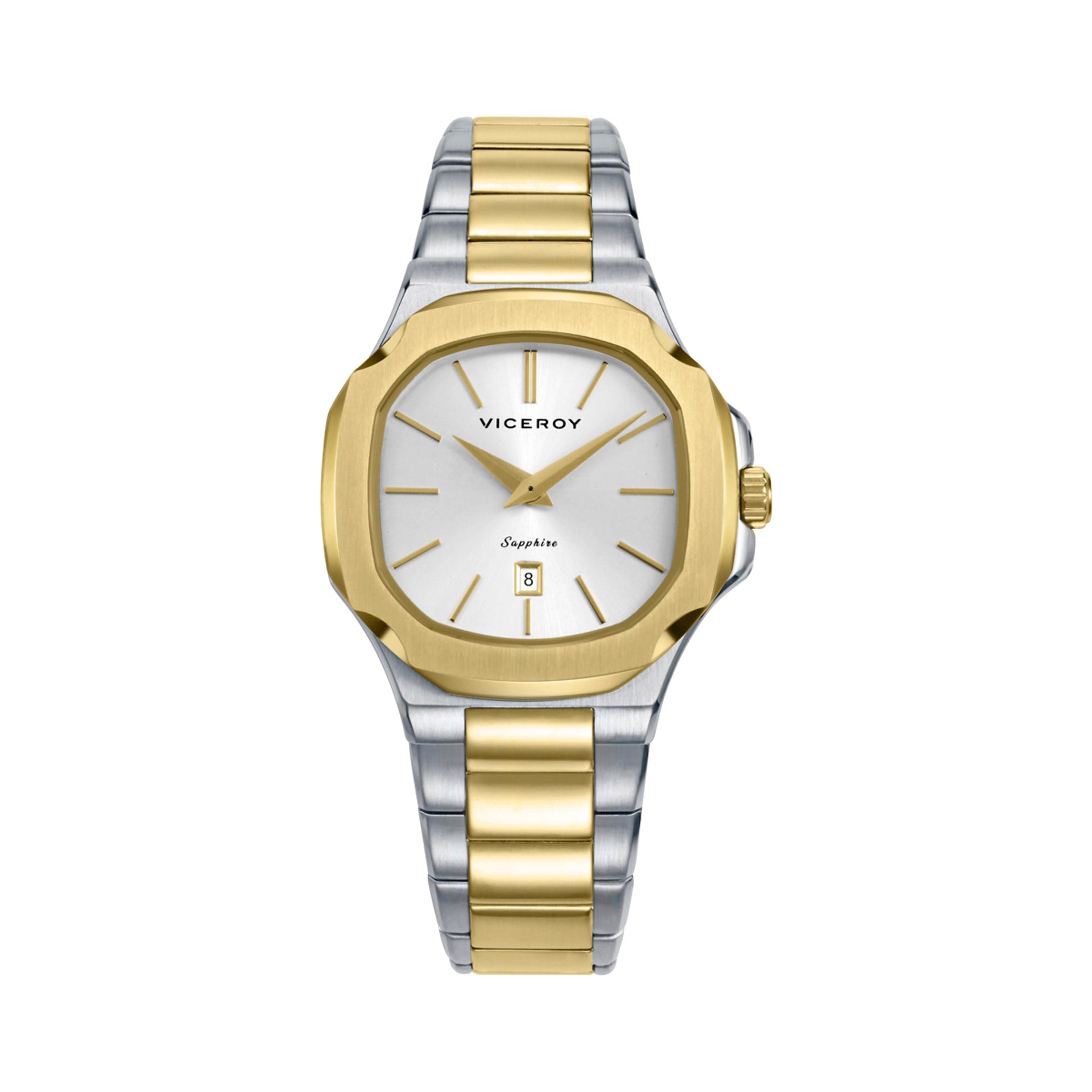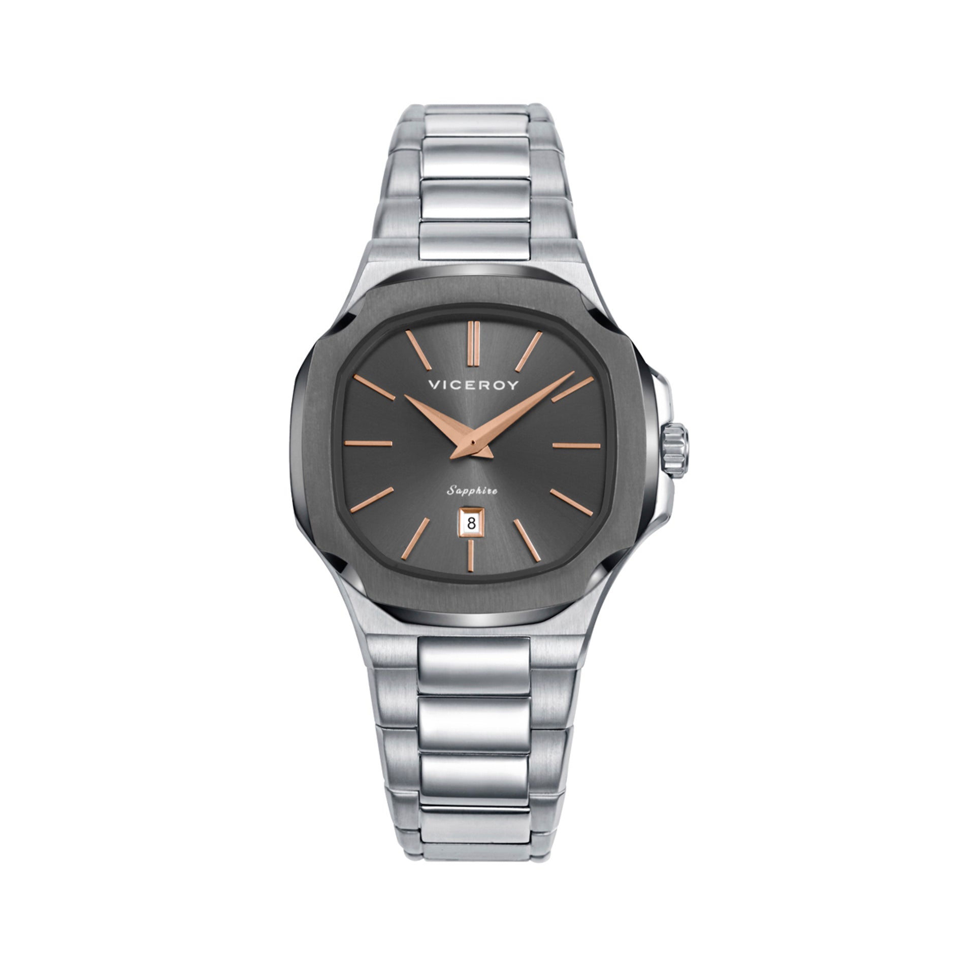 Reloj caja bitono de acero e Ip gris 10 Atm, brazalete de acero movimiento cuarzo, colección Laura Escanes